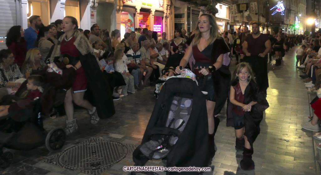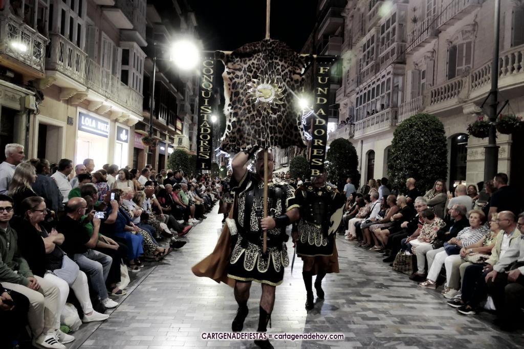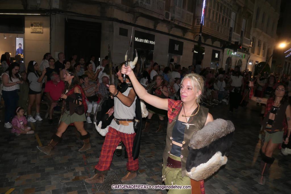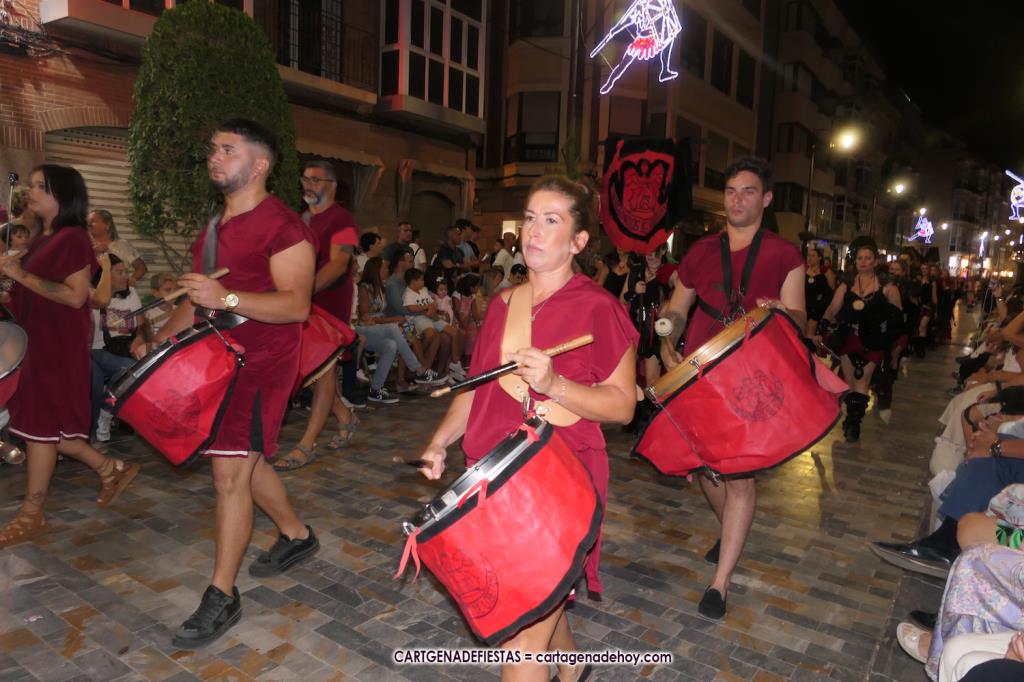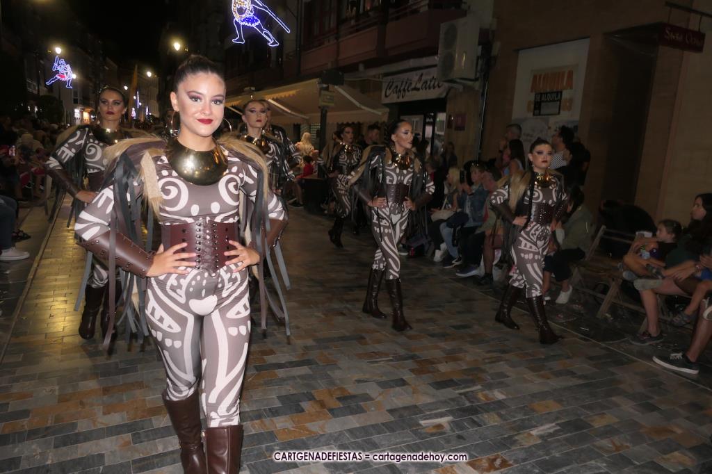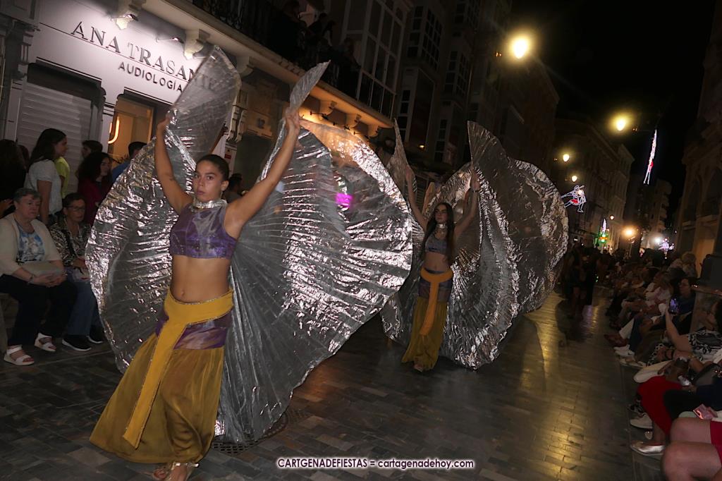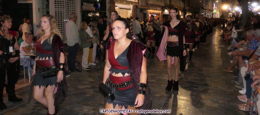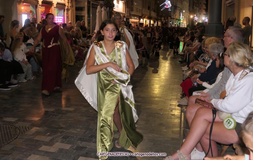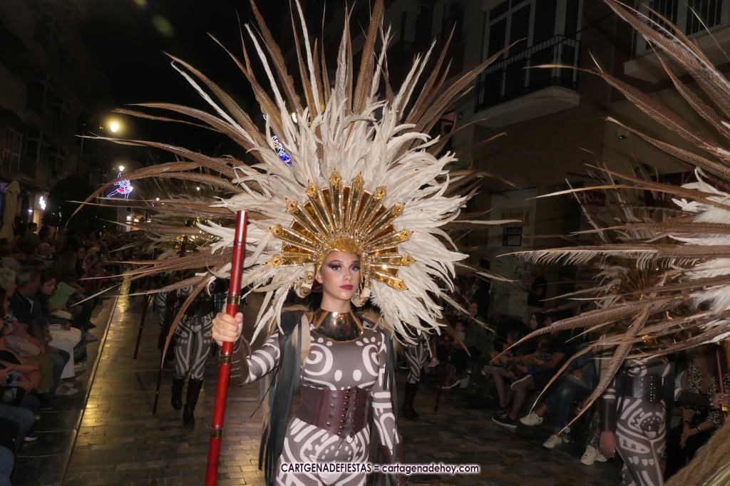 Unas cuatro mil personas (quizás más, pues hay 6.800 festeros) han desfilado por la ciudad con una gran variedad de vestuarios (todos con base histórica) y una amplia representación de personajes históricos y de dioses, unos en carne y hueso y otros a través de figuras que eran llevadas en movimiento. Durante unas tres horas, una infinidad de espectadores han disfrutado de paso de las tropas y legiones de Carthagineses y Romanos, que iban en turnos mezclados y aderezados por algunos grupos de animación. El destino ha sido el campamento.