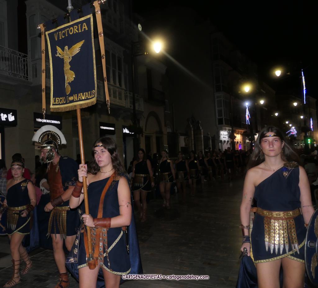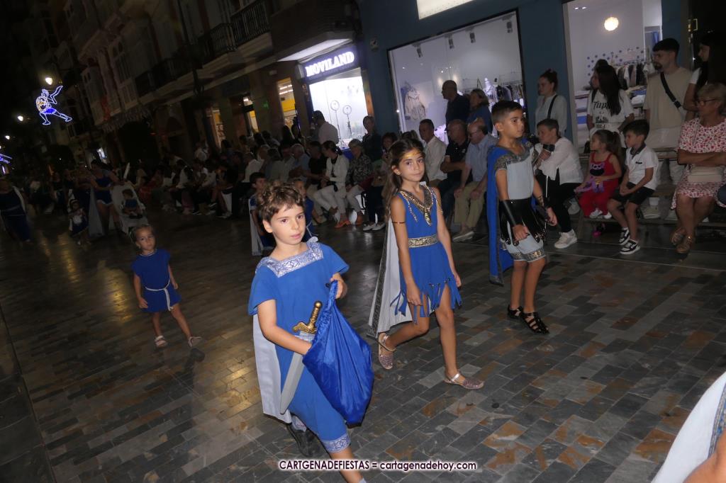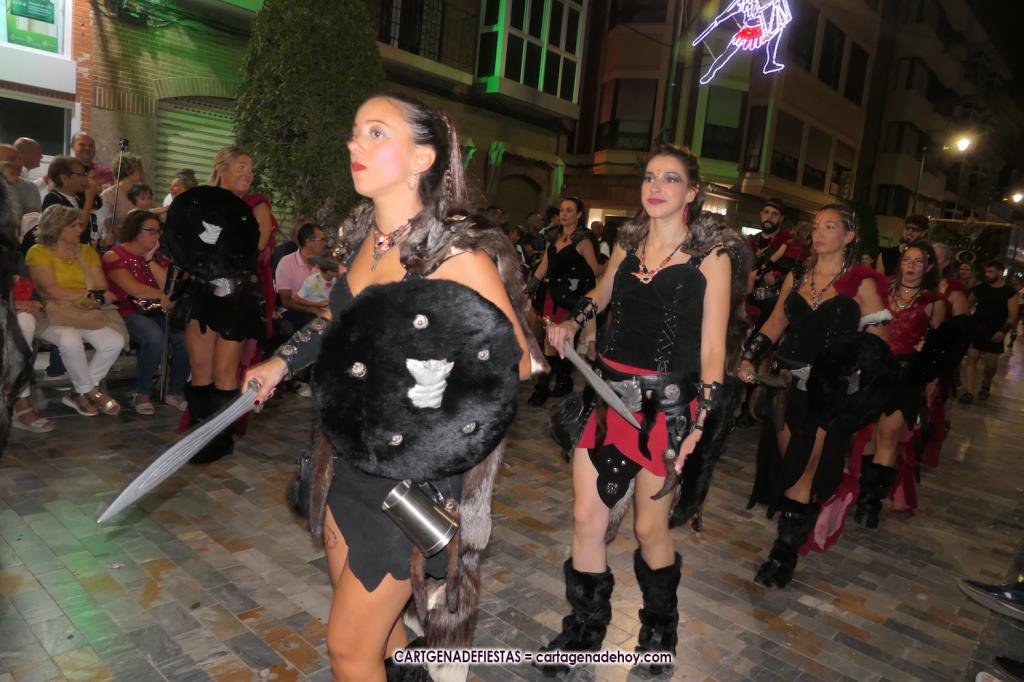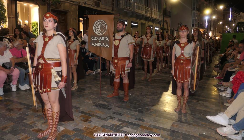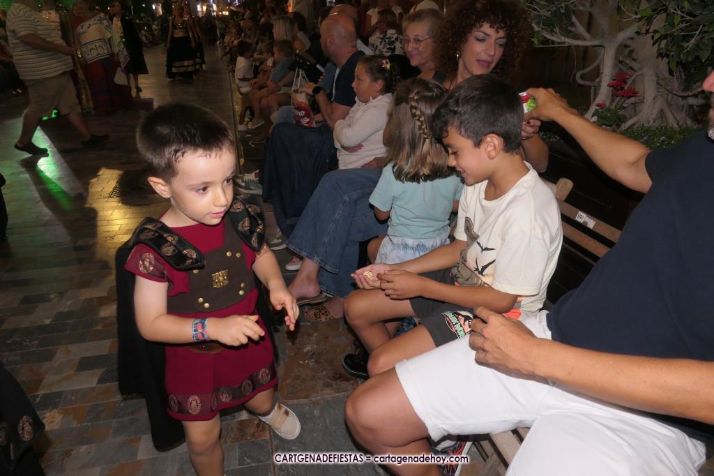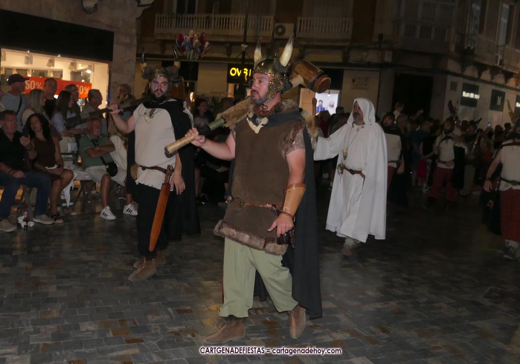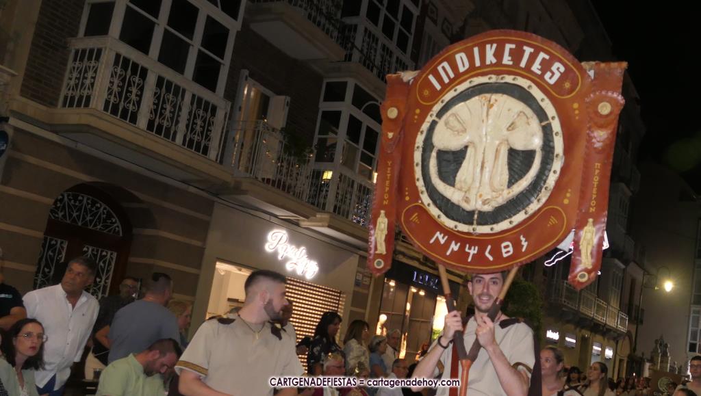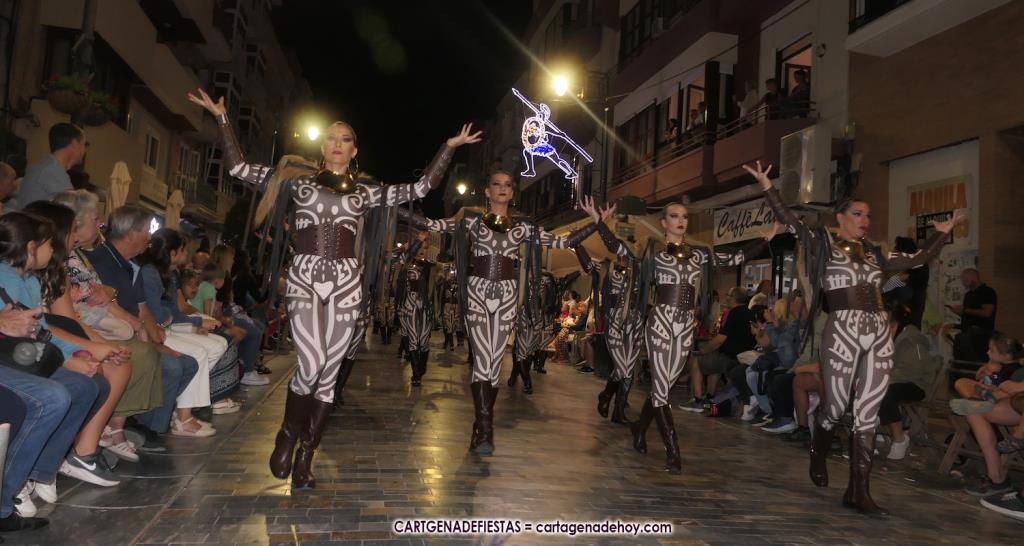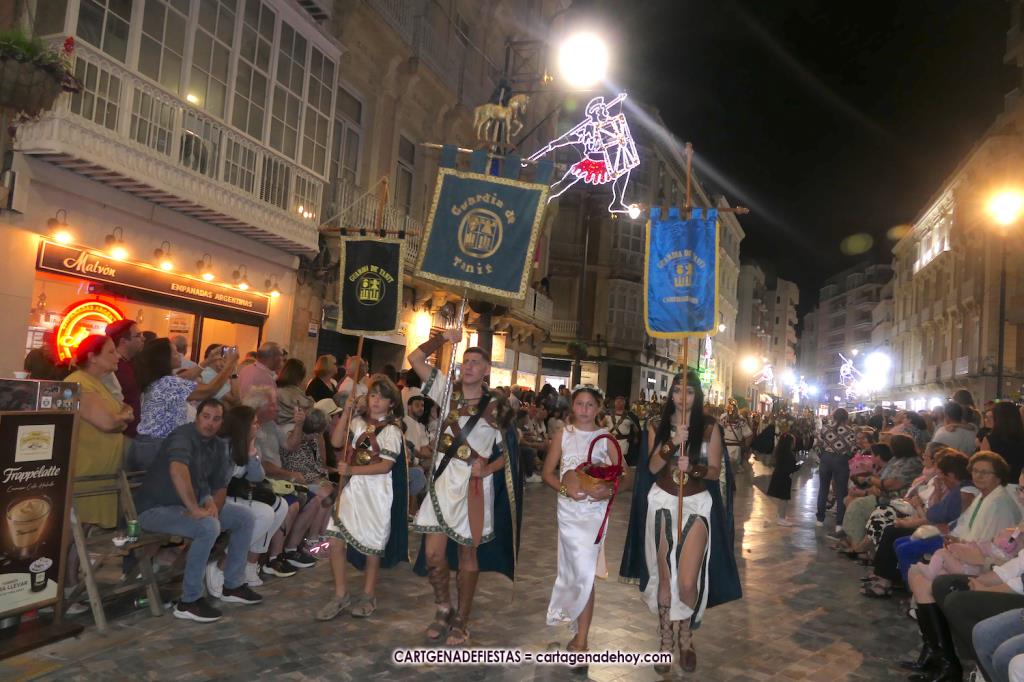 Unas cuatro mil personas (quizás más, pues hay 6.800 festeros) han desfilado por la ciudad con una gran variedad de vestuarios (todos con base histórica) y una amplia representación de personajes históricos y de dioses, unos en carne y hueso y otros a través de figuras que eran llevadas en movimiento. Durante unas tres horas, una infinidad de espectadores han disfrutado de paso de las tropas y legiones de Carthagineses y Romanos, que iban en turnos mezclados y aderezados por algunos grupos de animación. El destino ha sido el campamento.