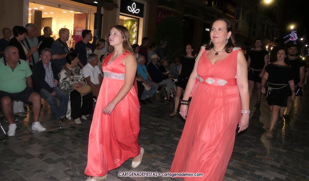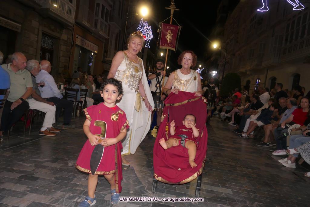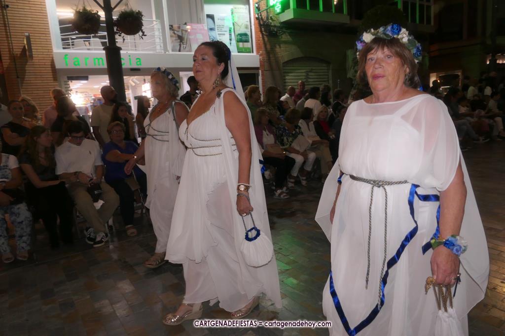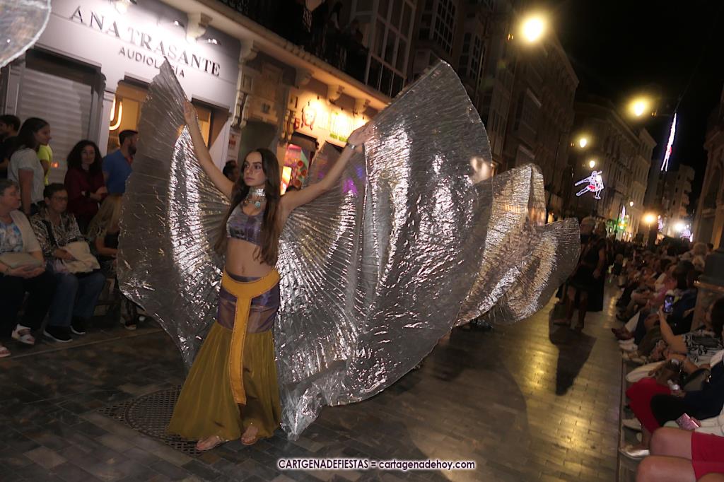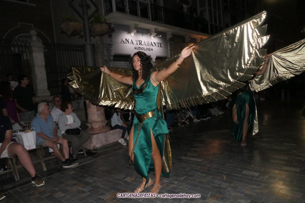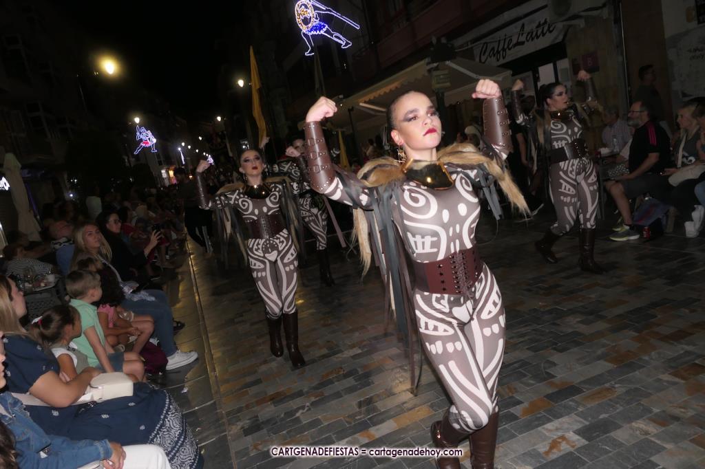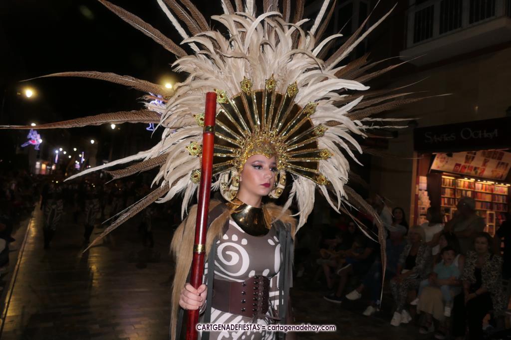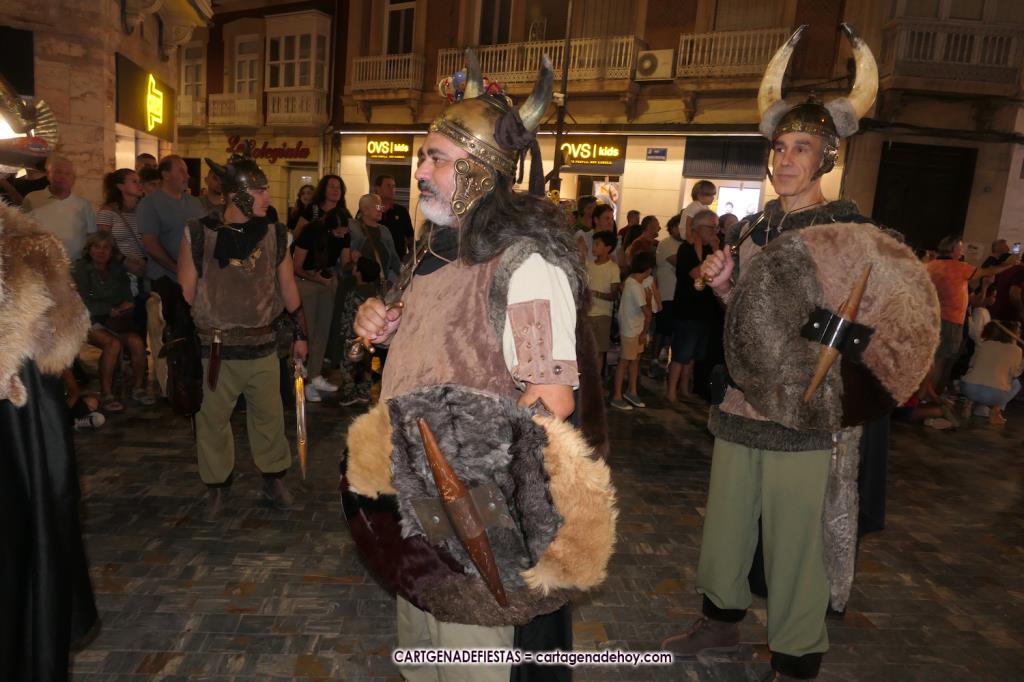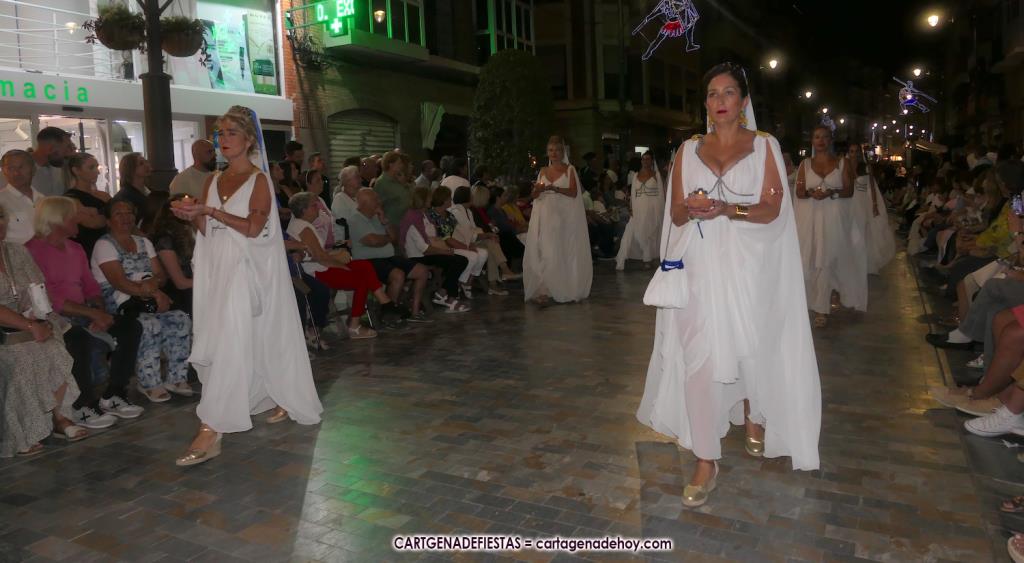 Unas cuatro mil personas (quizás más, pues hay 6.800 festeros) han desfilado por la ciudad con una gran variedad de vestuarios (todos con base histórica) y una amplia representación de personajes históricos y de dioses, unos en carne y hueso y otros a través de figuras que eran llevadas en movimiento. Durante unas tres horas, una infinidad de espectadores han disfrutado de paso de las tropas y legiones de Carthagineses y Romanos, que iban en turnos mezclados y aderezados por algunos grupos de animación. El destino ha sido el campamento.