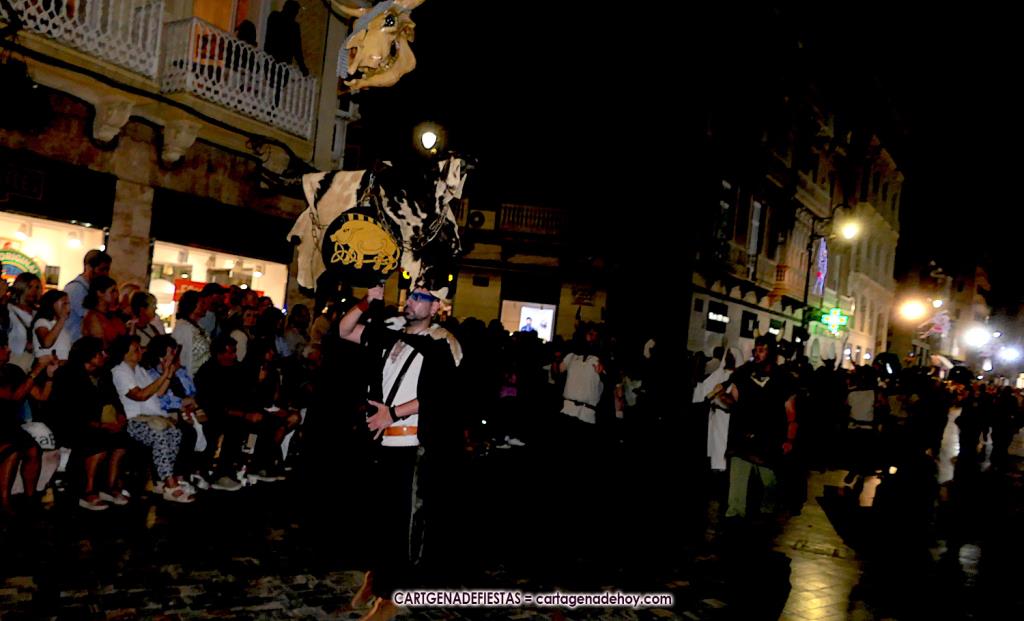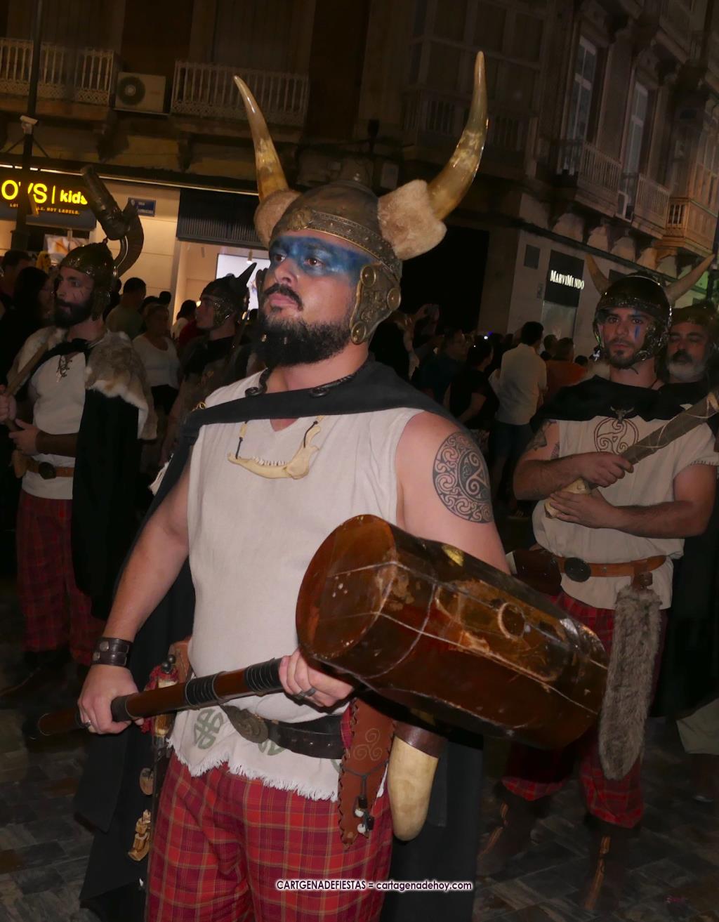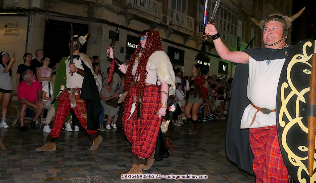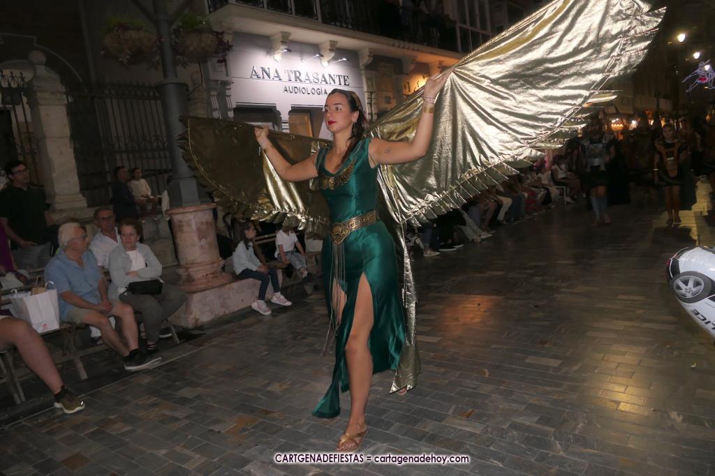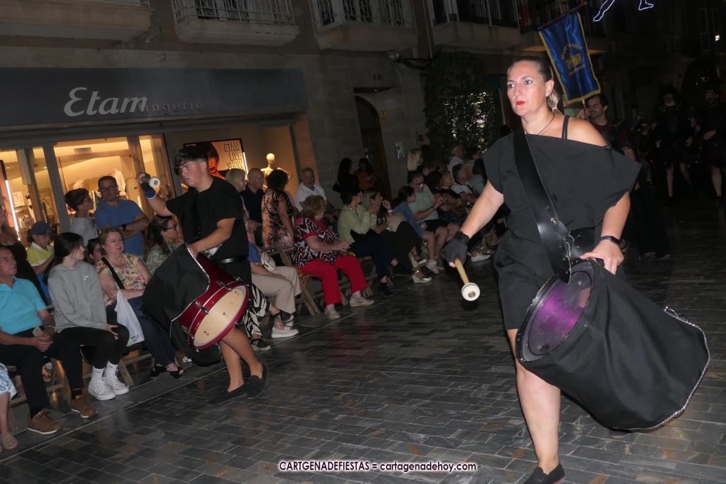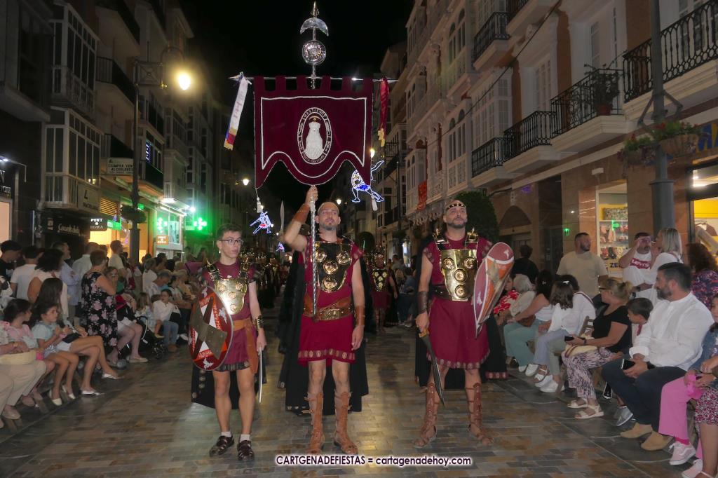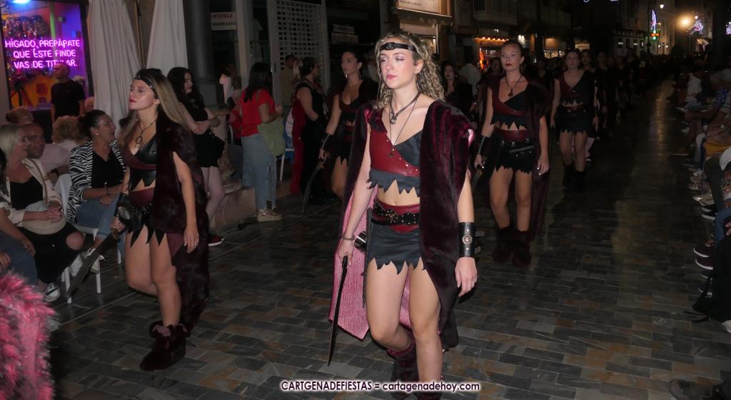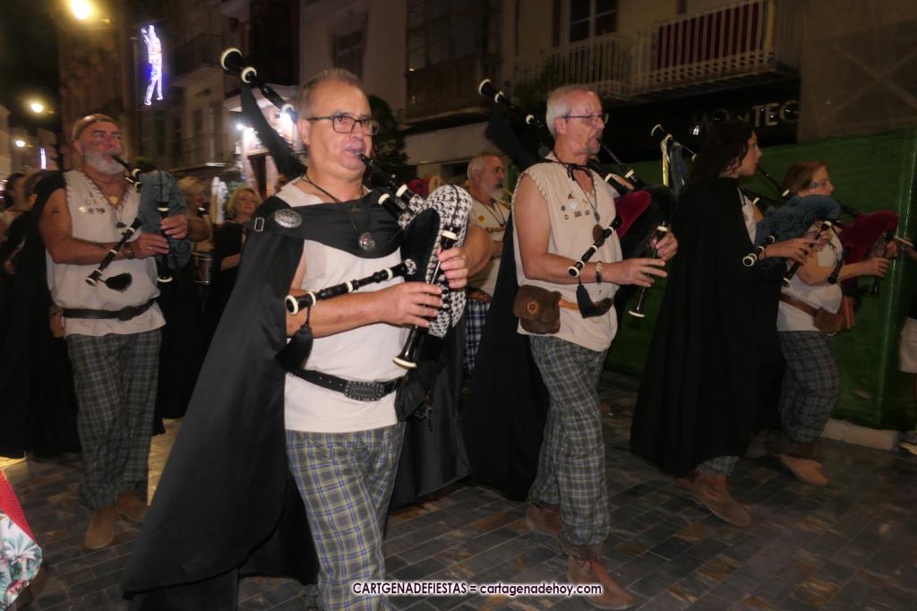 Unas cuatro mil personas (quizás más, pues hay 6.800 festeros) han desfilado por la ciudad con una gran variedad de vestuarios (todos con base histórica) y una amplia representación de personajes históricos y de dioses, unos en carne y hueso y otros a través de figuras que eran llevadas en movimiento. Durante unas tres horas, una infinidad de espectadores han disfrutado de paso de las tropas y legiones de Carthagineses y Romanos, que iban en turnos mezclados y aderezados por algunos grupos de animación. El destino ha sido el campamento.