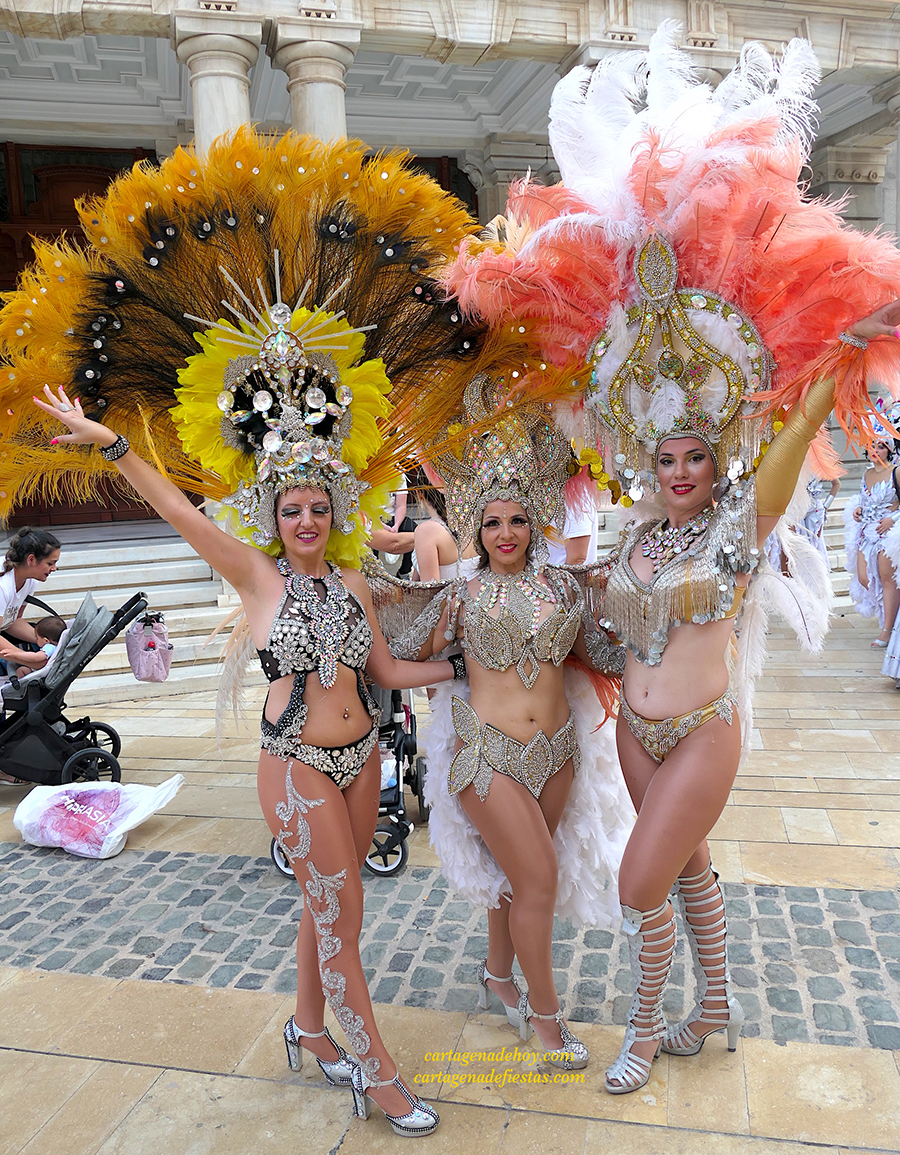 Integrantes de varias comparsas, como Divertilandia, Hondonada, Salgueiro y Paraíso, entre otras, han protagonizado esta tarde un desfile desde la calle del Carmen hasta la plaza del Ayuntamiento para anunciar, junto al lanzamiento de un castillo de fuegos artificiales, el inicio de una popular fiestas que por primera vez se celebra en junio.