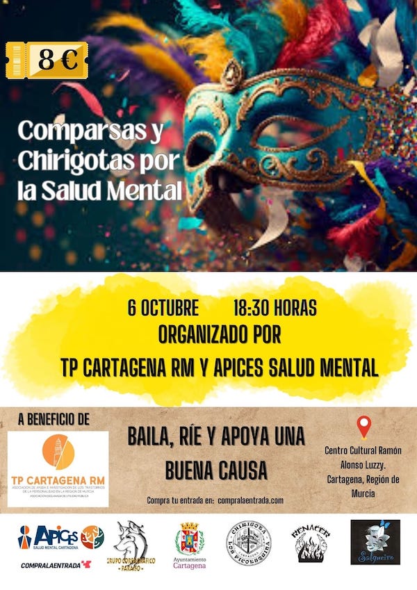 El próximo 6 de octubre, Cartagena se vestirá de fiesta con el espectáculo de comparsas y chirigotas, un evento especial cuya recaudación estará destinada íntegramente a TP CARTAGENA RM, una asociación sin ánimo de lucro que trabaja con personas con trastornos de la personalidad.El evento, que se celebra en el centro Ramón Alonso Luzzy de Cartagena, contará con la presencia de la Ilma. Sra. Dña Noelia Arroyo Hérnandez, así como la Sra. Directora general de Personas con Discapacidad, Dña. Miriam Pérez Albaladejo, miembros de la corporación municipal y de los grupos parlamentarios de la Asamblea Regional, así como de las juntas directivas de TPCARTAGENARM y APICES Salud Mental Cartagena.