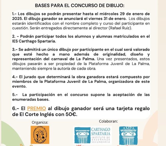 Plataforma Juvenil de La Palma convoca el certamen entre los alumnos del instituto Carthago Spartaria. El plazo para presentar los dibujos acaba este próximo jueves y el ganador se llevará un tarjeta regalo de 50 euros.