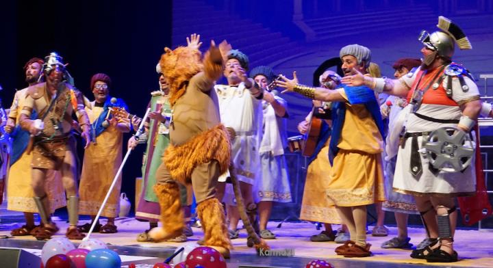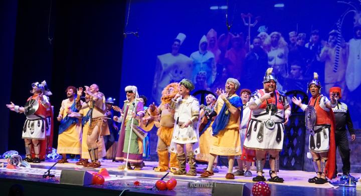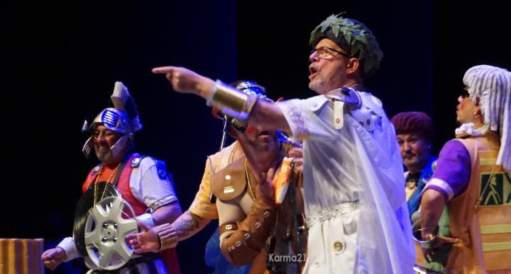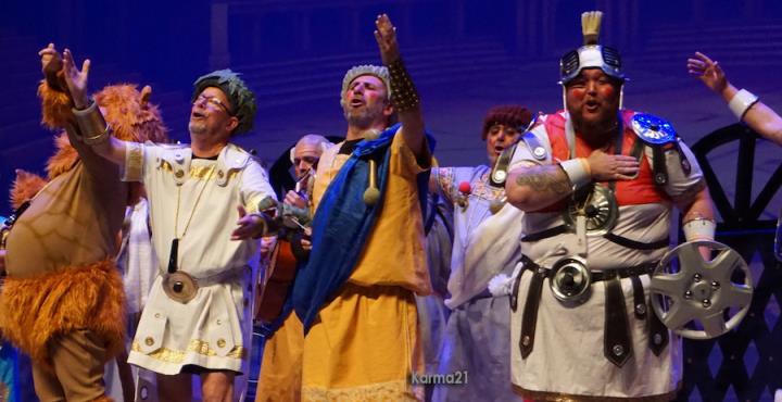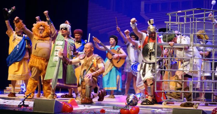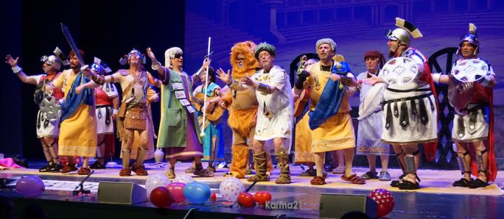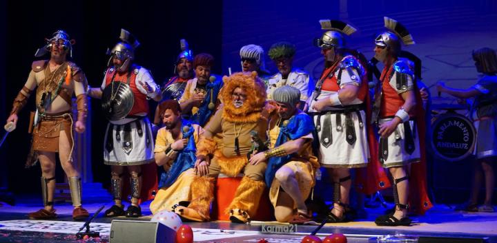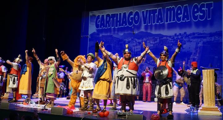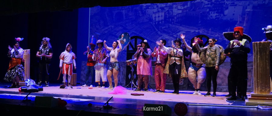 El grupo de Santa Lucía ha celebrado su 25 aniversario este año en el concurso de chirigotas del Carnaval de Cartagena con la representación de 'Cartagonova Imperium Festival', culminando con una canción de despedida en la que fueron nombrando los tipos que han lucido en este cuarto de siglo mientras iban saliendo amigos que los lucían.