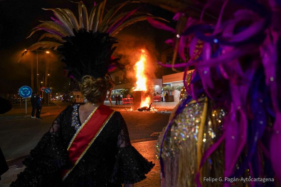 La falla que representa a la figura principal masculina del Carnaval de Cartagena fue quemada anoche en el puerto en unas anómalas fechas, pues salvo error u omisión (s.e.u.o.) no recordamos otra edición desde 1980 que fuera devorado por las ramas en tiempo procesionista, siendo el motivo en esta ocasión las lluvias, que obligaron a retrasar la fecha fijada en un principio. La noche culminó con el castillo de fuegos artificiales.