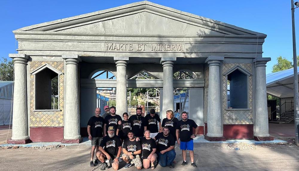 La legión de Marte y Minerva ya tiene levantada la fachada de su templo, que es el punto más elevado de los campamentos de las legiones. Las fotos muestran al equipo de montaje en estos días previos al inicio de Carthagineses y Romanos.