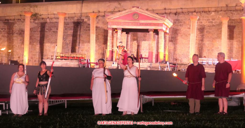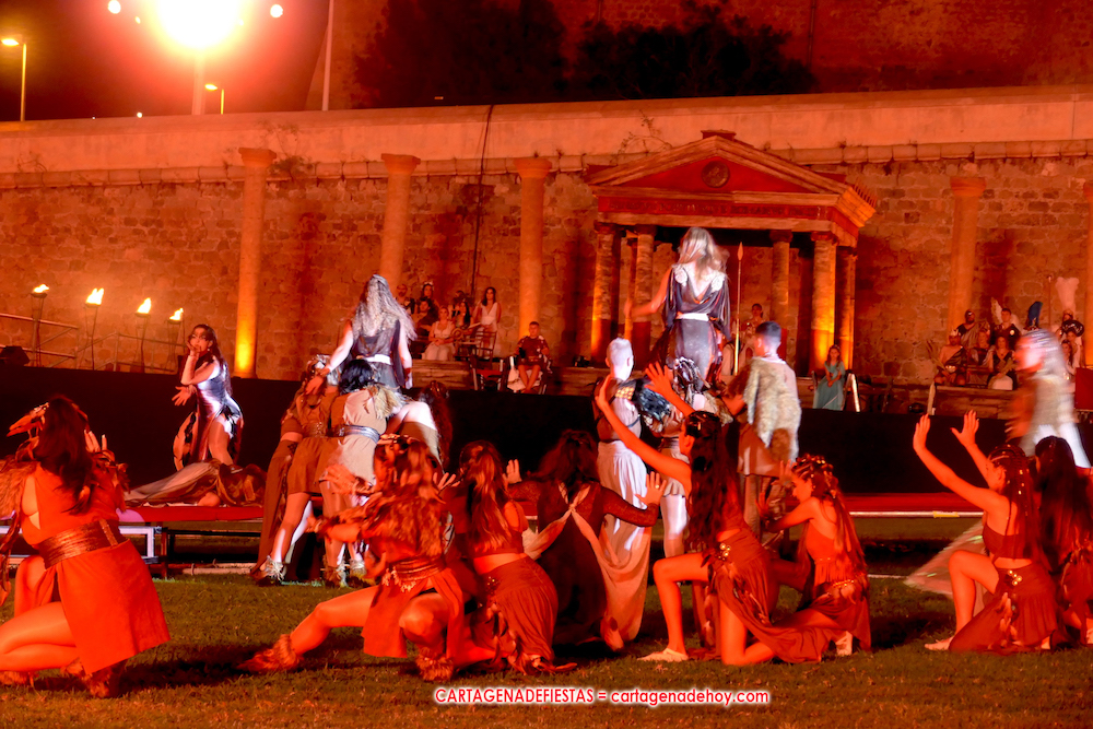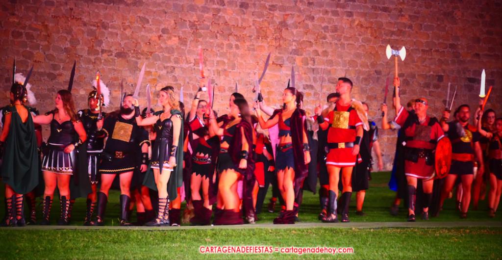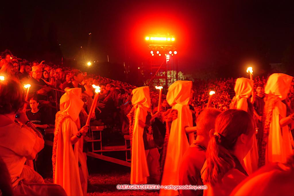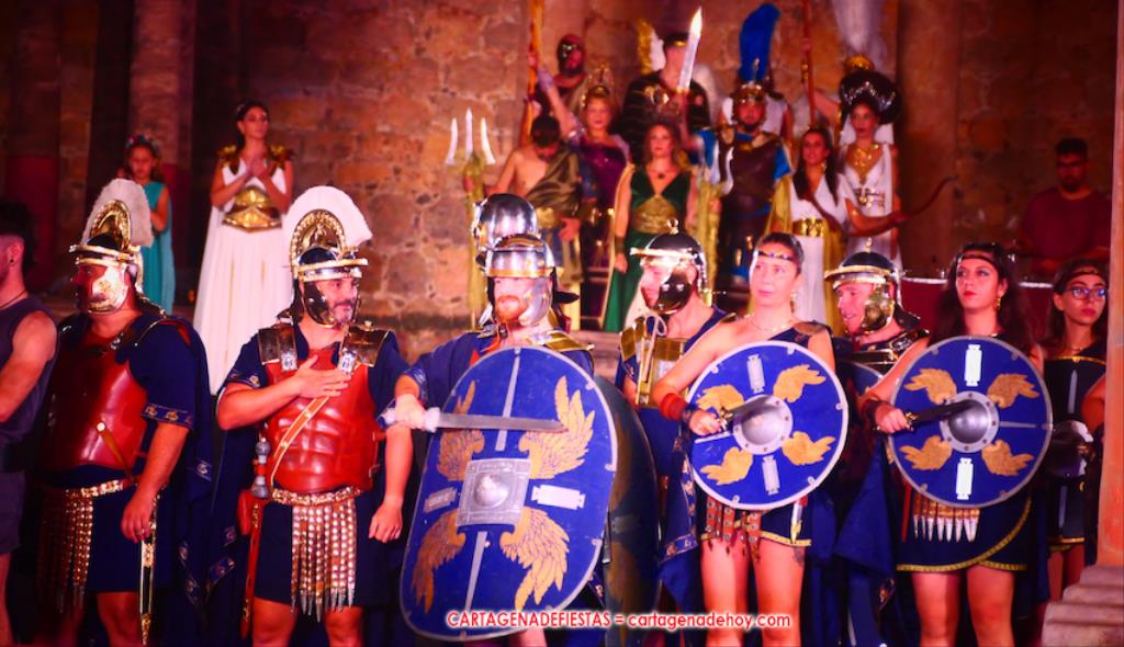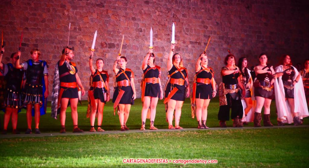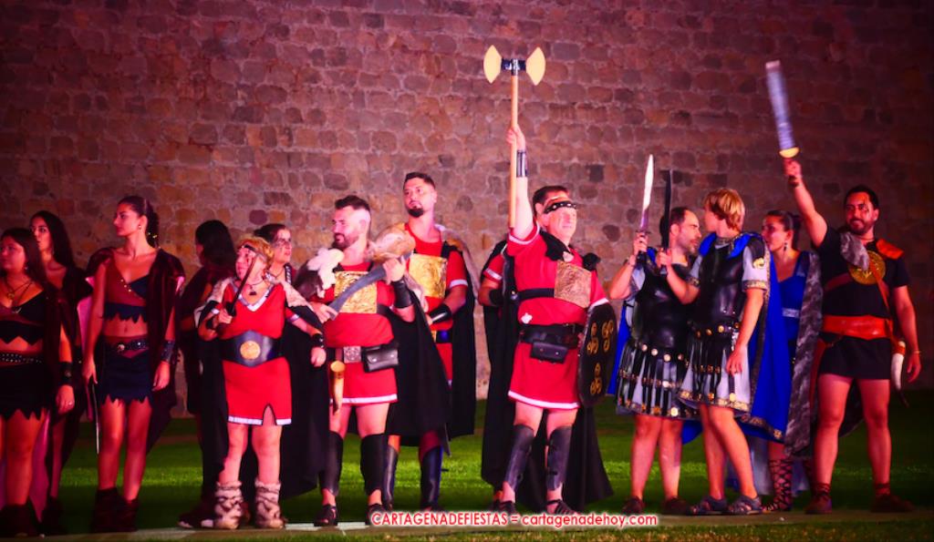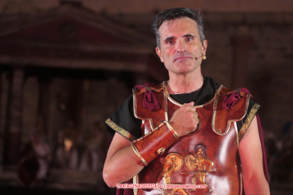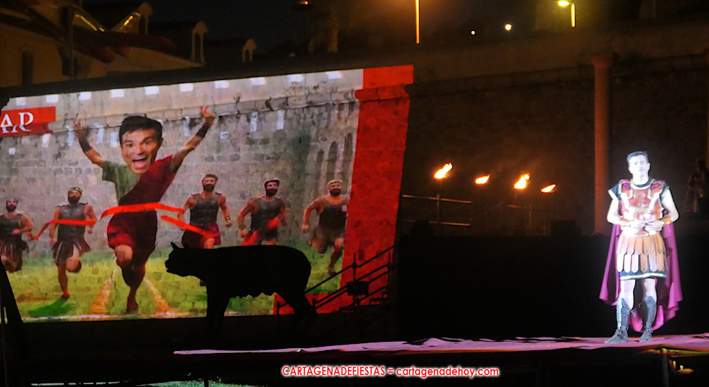 Todavía queda algo de la crónica, el presentador. Me gustó cómo llevó la presentación Luis Larrodera. Se nota que tiene recursos para salir de cualquier situación (cuando se perdió una bandera) y para arrancar sonrisas con chascarrillos o un chiste, como el que lanzó: ¿Por qué los romanos no llevan tirantes? Porque son más de centuriones. Autobautizado como 'Achus Pijus Magnífico', auspició una gran 'ola' con retorno y utilizó una improvisada entrevista a Escipión y Emilia Paula para divulgar tesoros de nuestra gastronomía: michirones, caldero y asiático. Luego, es de suponer que en un apartado pactado, se dirigió a 'la gobernardora' (la alcaldesa) y al 'emperador' (presidente del gobierno regional), diciéndole a López Miras si había venido "bien o en tren", lo que arrancó muchos aplausos por el olvido ferroviario que tiene esta tierra. "A orillas del Mediterráneo hay un pueblo que no quiere ser más que los demás, pero tampoco menos", expresó. Larrodena tenía libertad para interactuar con el público y en una de sus iniciativas aportó al espectáculo el momento de mayor ternura y simpatía. Sacó de las primeras filas al pequeño festero Nacho, de Rehenes de Carthago, quien, con cinco años de edad, cautivó a todos.