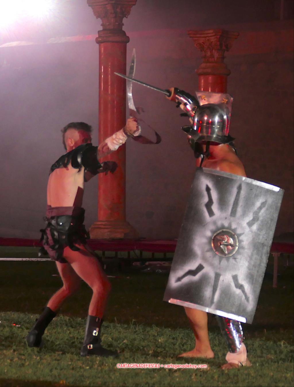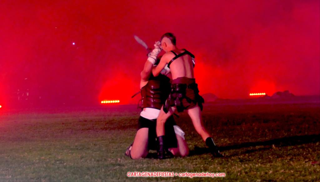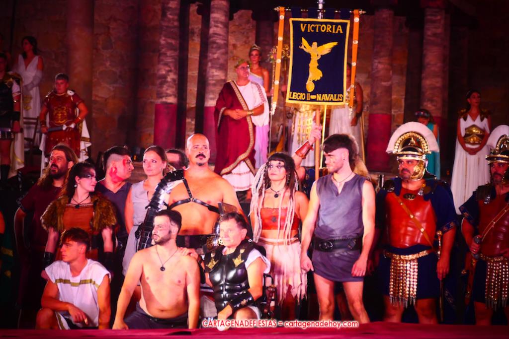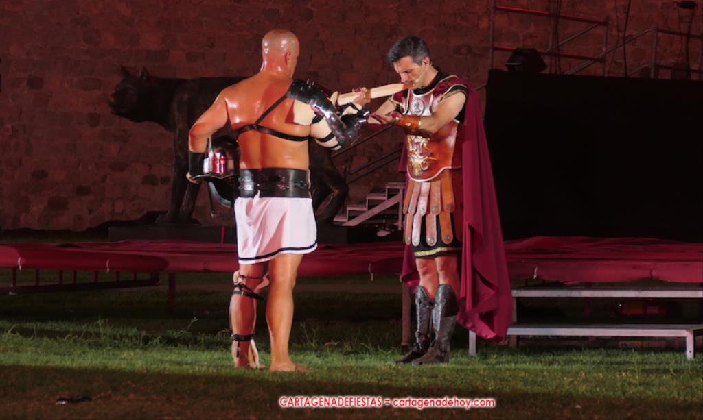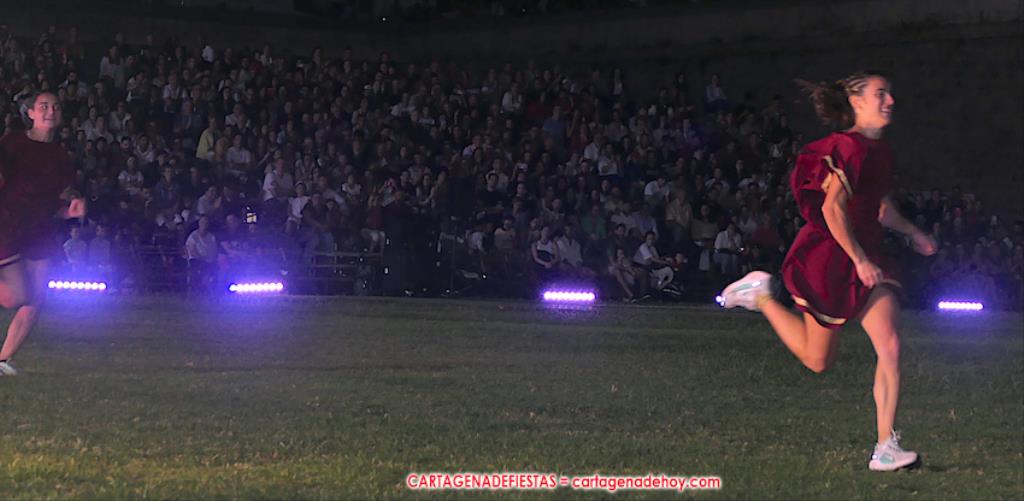 V. ROMA AT ETERNA. Turno para la competición con dos carreras, entre cuyos participantes (todos atletas del UCAM Cartagena) estaban dos promesas del atletismo cartagenero, ahora en edad sub-20, Eva Ibarra y Jaime Mendoza. La carrera que ganó ella arrancó numerosos aplausos por la velocidad que cogió. A su conclusión llegaron legionarios con esclavos, quienes lucharon entre sí en el circo. Los vencedores se enfrentaron después a los afamados gladiadorses. '¡Pugnate!'. Triunfó Atilius, pero el publico instó al cónsul a salvar la vida (vita) del esclavo que se metió en la final. Después, el gladiador le entregó la espada de madera de la libertad.