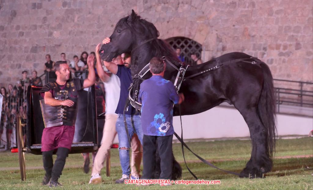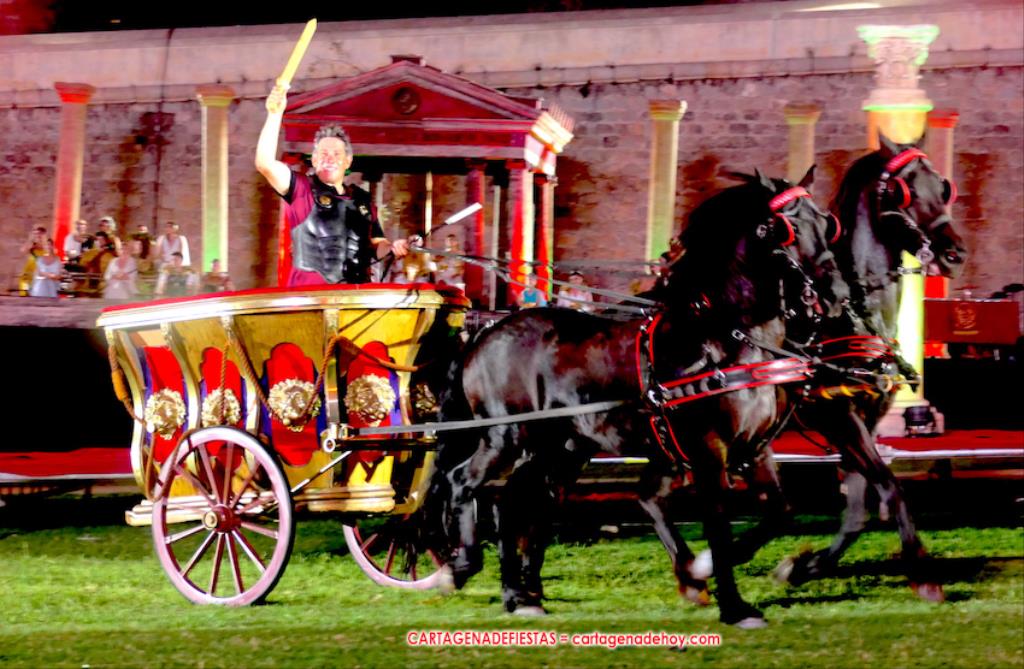 IV. POTESTAS MILITARIS. En este capítulo tuvo lugar la entrada de Escipión y Emilia Paula (con rostro de ir temerosa) en una cuádriga tirada por el cartagenero Agustín Solano (su cuadra cubrio el capítulo equino del Circo). En este momento se había cumplido una hora de ameno espectáculo. A continuación entraron doscientos festeros de las 25 legiones a golpe de tambor y con saludas al cónsul, para a continuación tener lugar una batalla, cuya mejor imagen dejaron los jinetes a caballo.