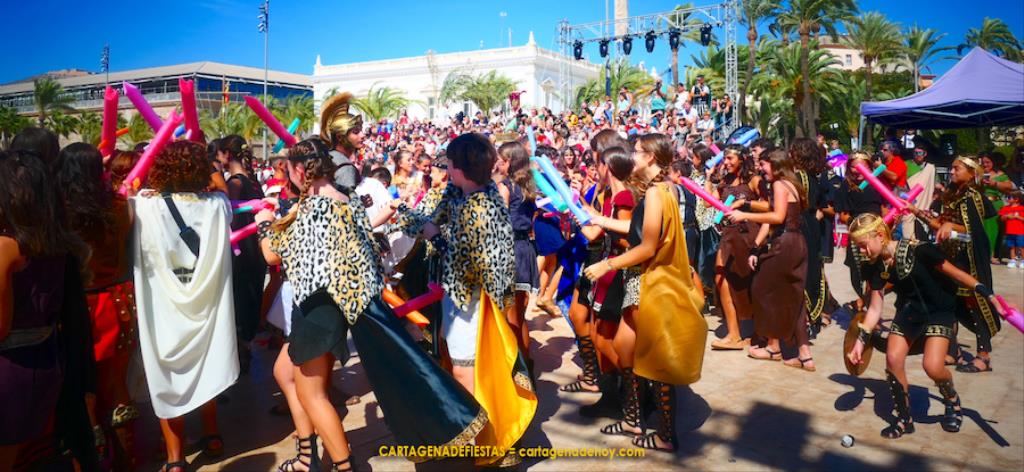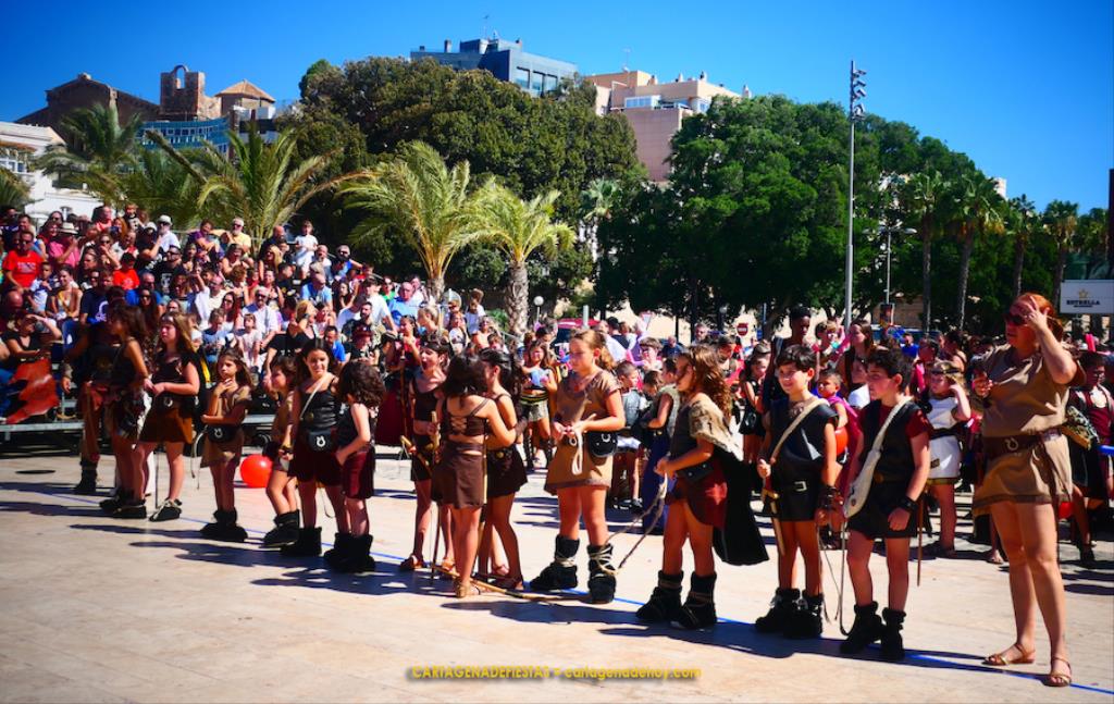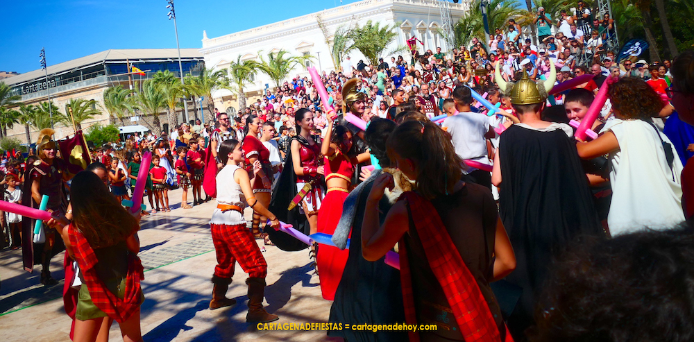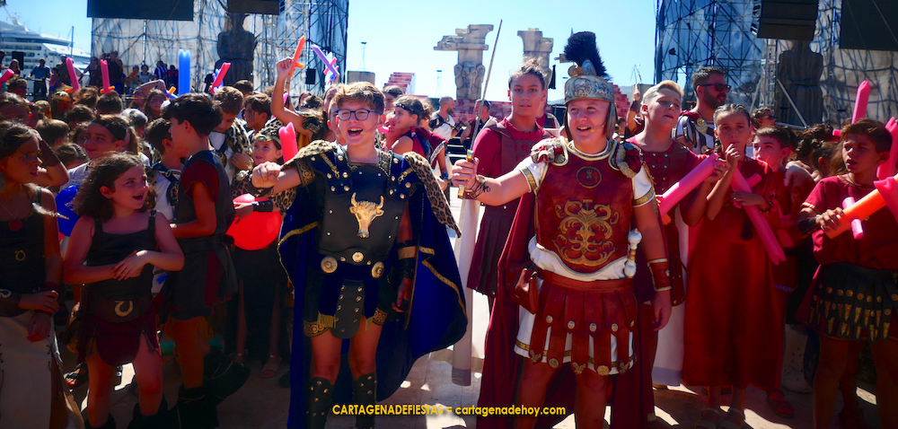La brisa del mar ha envuelto este año la batalla infantil de Carthagineses y Romanos en el puerto de Cartagena, donde numerosos chavales de tropas y legiones han disfrutado con la representación y combate de la toma de la ciudad de Qart-Hadast.