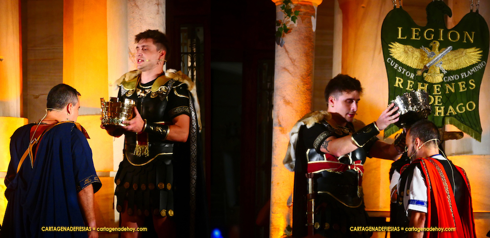 Después llega la imposición de las coronas murales que Roma entregaba al primer soldado que cruzaba las murallas enemigas. En esta tierra, por única vez en la historia romana, se adjudicaron dos. Una fue para el infante Quinto Trebelio de la Legión IV y otra para el marino Sexto Digicio de la Legio II Navalis. En esta ocasión, esta puesta en escena tenía una significación especial, pues Gerardo González, quien ha interpretado el papel de Quinto durante años, falleció en agosto. Fue su hermano quien lo ha hecho en esta ocasión. Al final de la obra, todos los protagonistas elevaron sus miradas y mano al cielo para dedicarle la obra a Gerardo.
