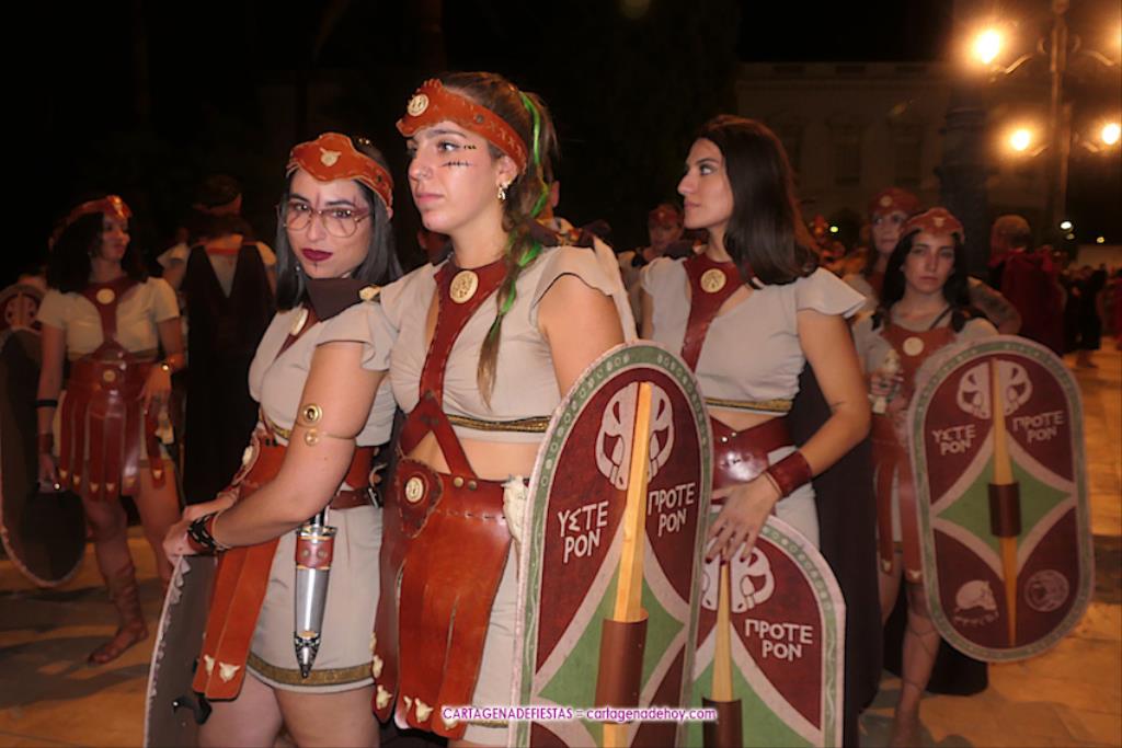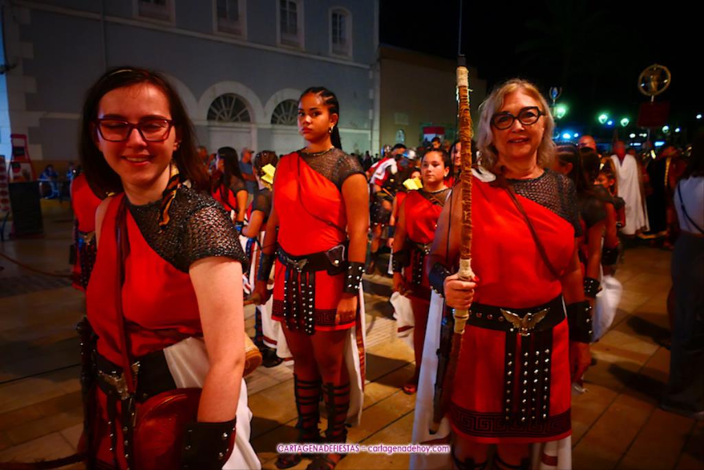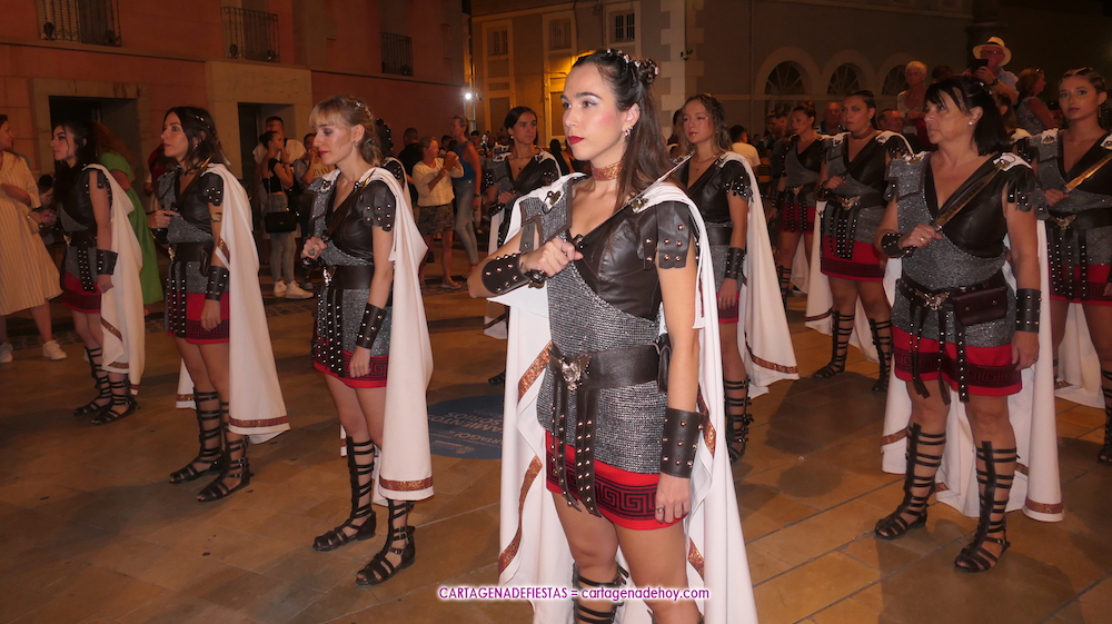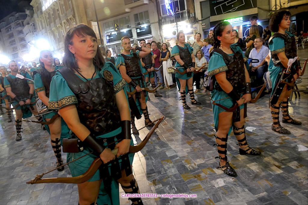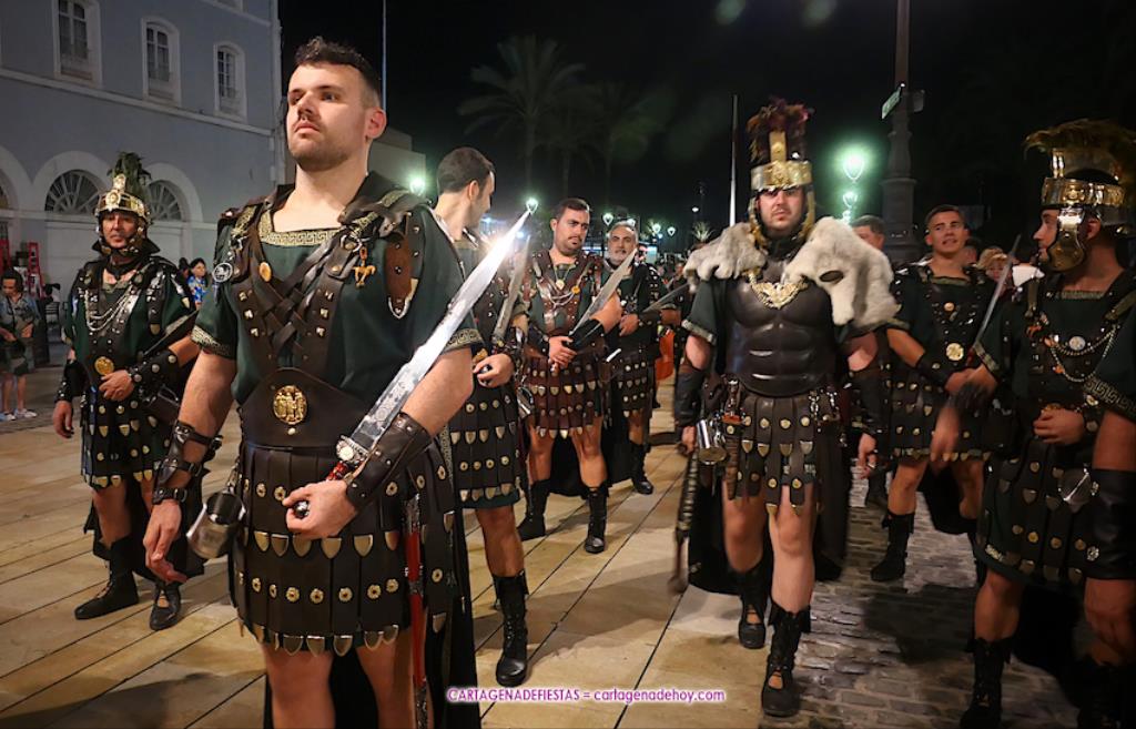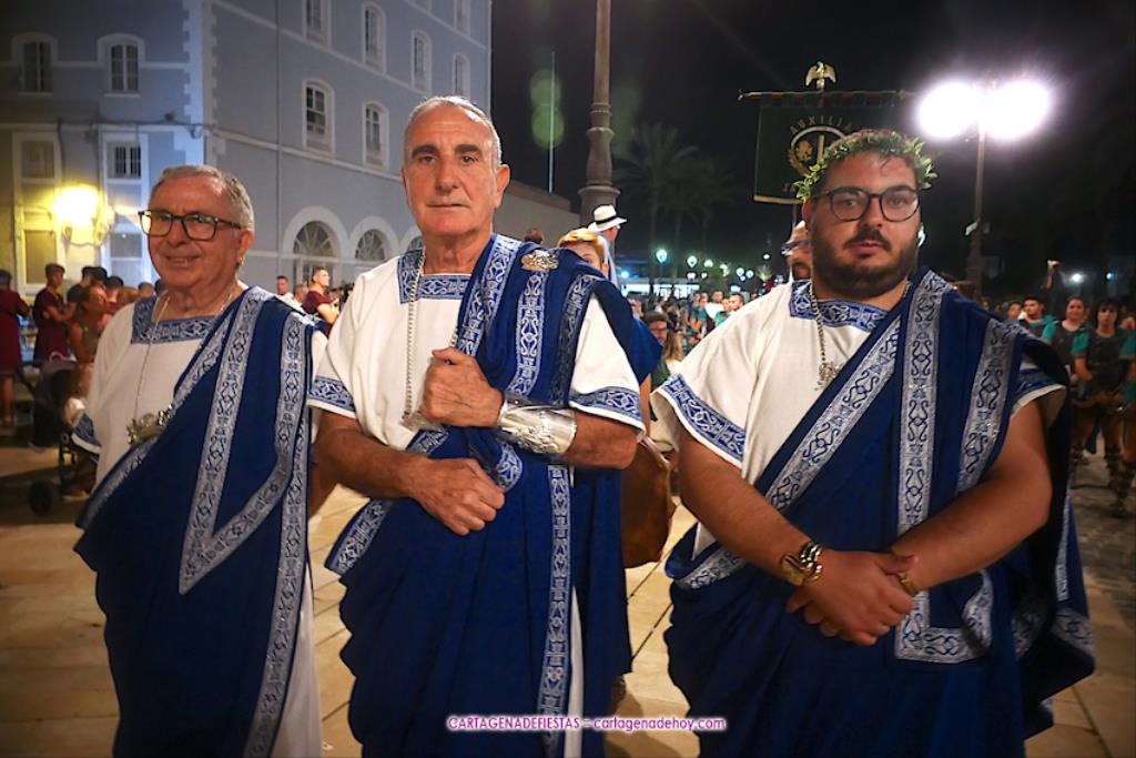 Unas dos mil personas protagonizaron el ‘Desfile de la victoria’ del Senado en las Fiestas de Carthagineses y Romanos, que comenzó en la plaza del Ayuntamiento y expiró en el campamento festero. Por cierto, si en otros artículos hemos reseñado importantes retrasos que han tenido algunos actos de estas fiestas, apuntar que tanto las representaciones de las coronas murales, liberación de rehenes y proclamación de la Ley de Roma fueron (casi) puntuales, saliendo de inmediato el gran desfile, lo que evitó espacios sin actividad para el espectador.