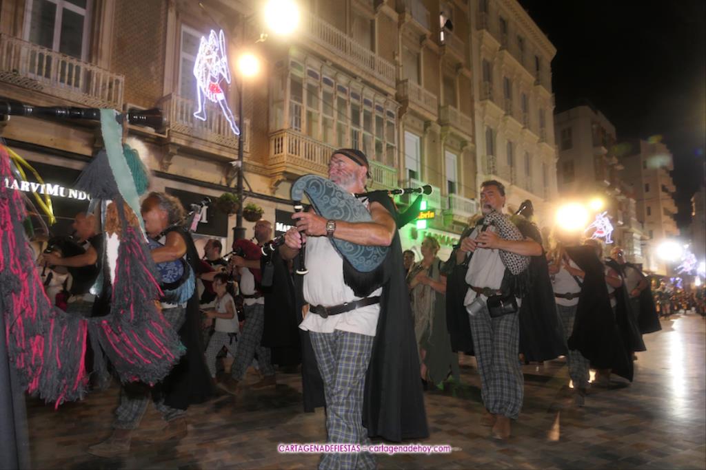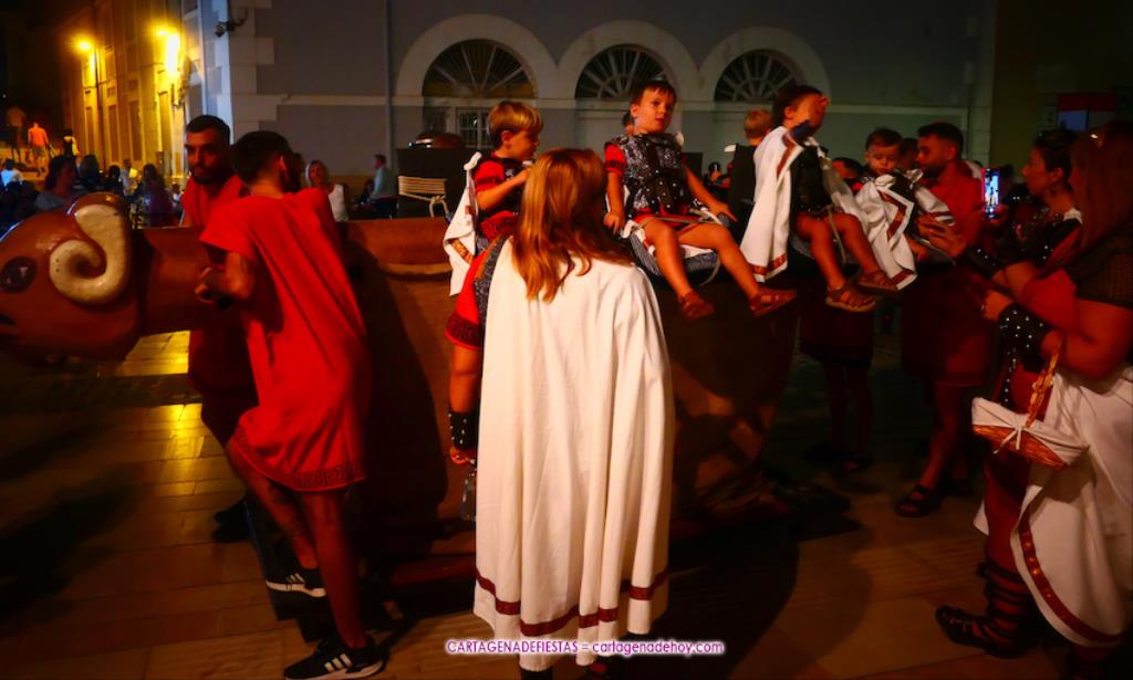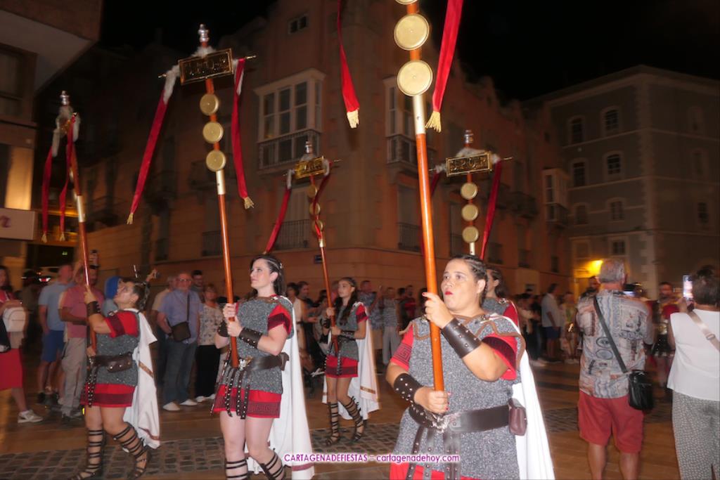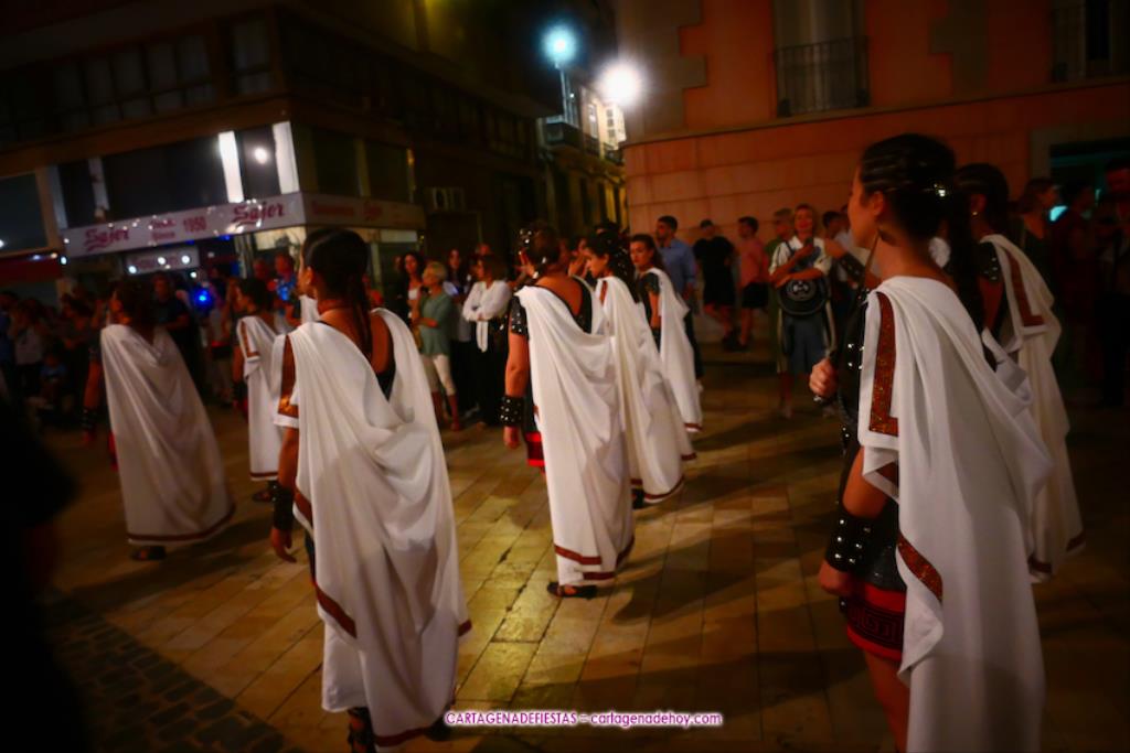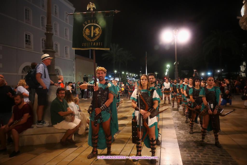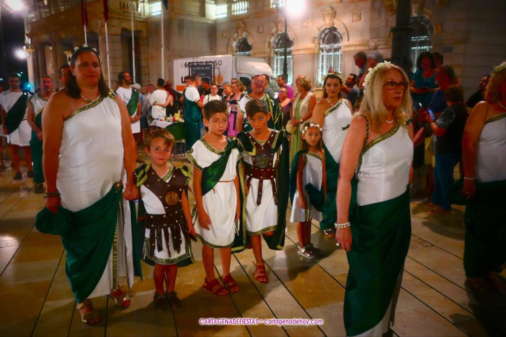 Unas dos mil personas protagonizaron el ‘Desfile de la victoria’ del Senado en las Fiestas de Carthagineses y Romanos, que comenzó en la plaza del Ayuntamiento y expiró en el campamento festero. Por cierto, si en otros artículos hemos reseñado importantes retrasos que han tenido algunos actos de estas fiestas, apuntar que tanto las representaciones de las coronas murales, liberación de rehenes y proclamación de la Ley de Roma fueron (casi) puntuales, saliendo de inmediato el gran desfile, lo que evitó espacios sin actividad para el espectador.