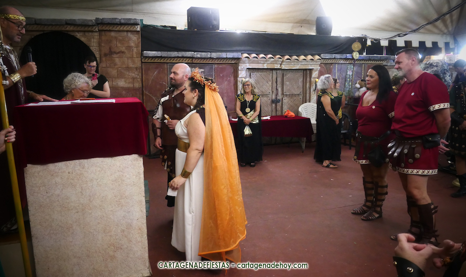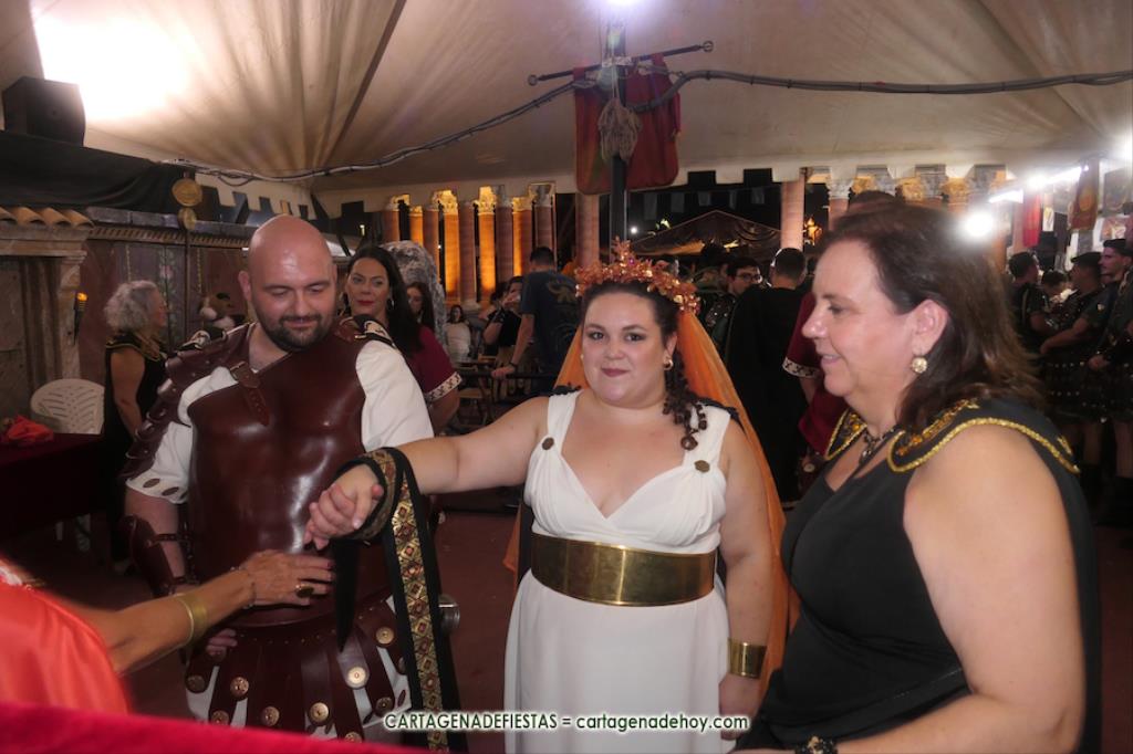 La legión de Triunviros de Cartagonova arropa este tradicional acto de campamento, llevando todos el uniforme de gala y formando un pasillo a los novios. Destaca que Pedro Vidal anunció que este es su último año como 'casamentero romano' después de más de veinte años, siendo el enlace entre los dioses Venus y Vulcano, que tuvo lugar tras las bodas que recogemos en este artículo, su despedida como gran 'Flamine Dial'.