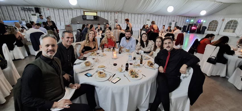 La cena gala de Navidad de la comparsa del Carnaval de Cartagena contó con la presencia de la tropa de Carthagineses y Romanos, a la que entregaron una piedra artística con la imagen de ambos grupos y el texto: 'Unidos por la tradición y el legado'. En la foto, Miguel Sánchez Juaneda la recoge como presidente festero de manos de Alfonso Sánchez, homónino de Salgueiro.