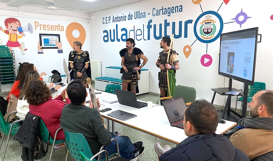 Dos festeros púnicos y un legionario han visitado el colegio para dar a conocer la historia y las fiestas a docentes de varios colegios de España dentro del proyecto 'Aníbal en Europa'.