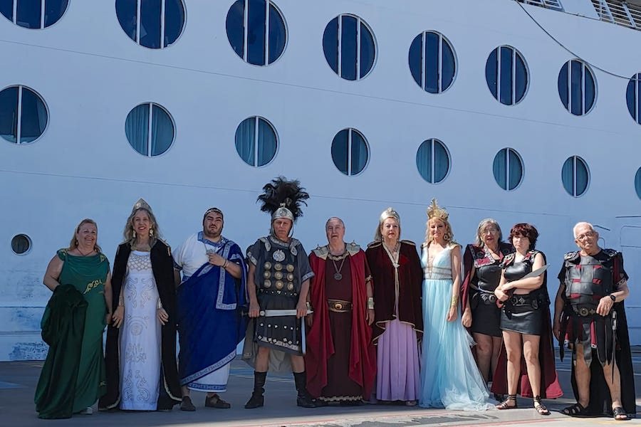 Un representación de festeros de Carthagineses y Romanos de diferentes tropas y legiones continúan con su encomiable misión de difundir las históricas fiestas de Cartagena recibiendo a los turistas que llegan en los cruceros vestidos de época.
