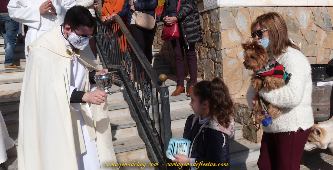 El barrio de San Antón está teniendo su gran día, aunque dentro de los parámetros de las restricciones anticovid, y esta mediodía ha vuelto a vivir con intensidad la popular bendición de animales a la conclusión de una eucaristía que ha presidido el reverendo Juan Apellaniz, capellán de la Armada, ya jubilado, y que está adscrito a esta parroquia. El aforo autorizado dentro de la iglesia se ha completado totalmente y entre los asistentes cabe destacar a la alcaldesa y a la vicealcaldesa de Cartagena, respectivamente, Noelia Arroyo y Ana Belén Castejón, además de otros ediles municipales, como José López. También se encontraban, entre otros, el hermano mayor de la Hermandad de Romeros de San Ginés de la Jara (Andrés García), el presidente de la asociación de vecinos, Fernando Gallego, y el grupo de romeras del patrono, ataviadas con vestuarios tradicional.