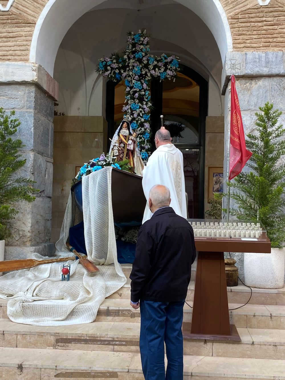 Con la celebración de la Cruz de Mayo se desveló el misterio de qué hacía una barca en la peatonal calle del centro histórico de Cartagena. El motivo es que fue en la embarcación donde la Archicofradía de Nuestra Señora del Carmen llevó a cabo el montaje de la floreada cruz, que, tras la celebración de la eucaristía, fue bendecida por el párroco.