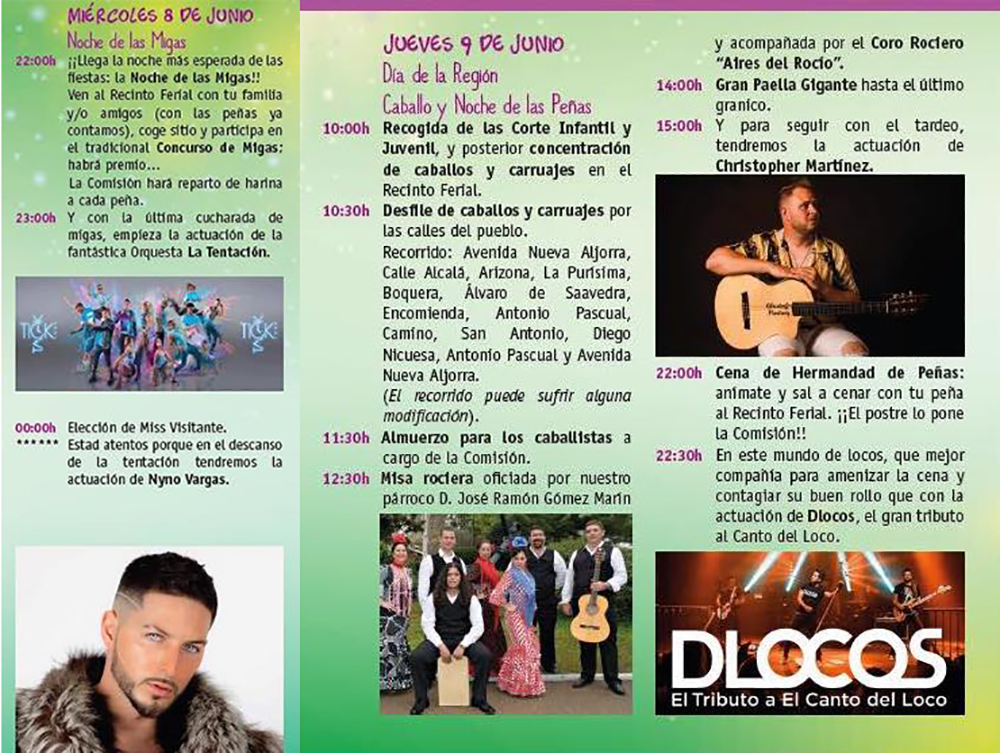 Los festejos aljorreños tienen esta noche la popular velada con este tradicional producto gastronómico, aderezada por la orquesta ‘La Tentación’ y Nyno Vargas, mientras que el jueves la actividad comienza por la mañana con el desfile de caballos y carruajes, para después tener lugar una misa rociera y la degustación de un arroz gigante, con la voz de Christopher Martínez en la sobremesa. Por la noche, cena de hermandad de las peñas. En la foto adjunta se observa a Filiú & Cía, que actuó anoche en el recinto festero.