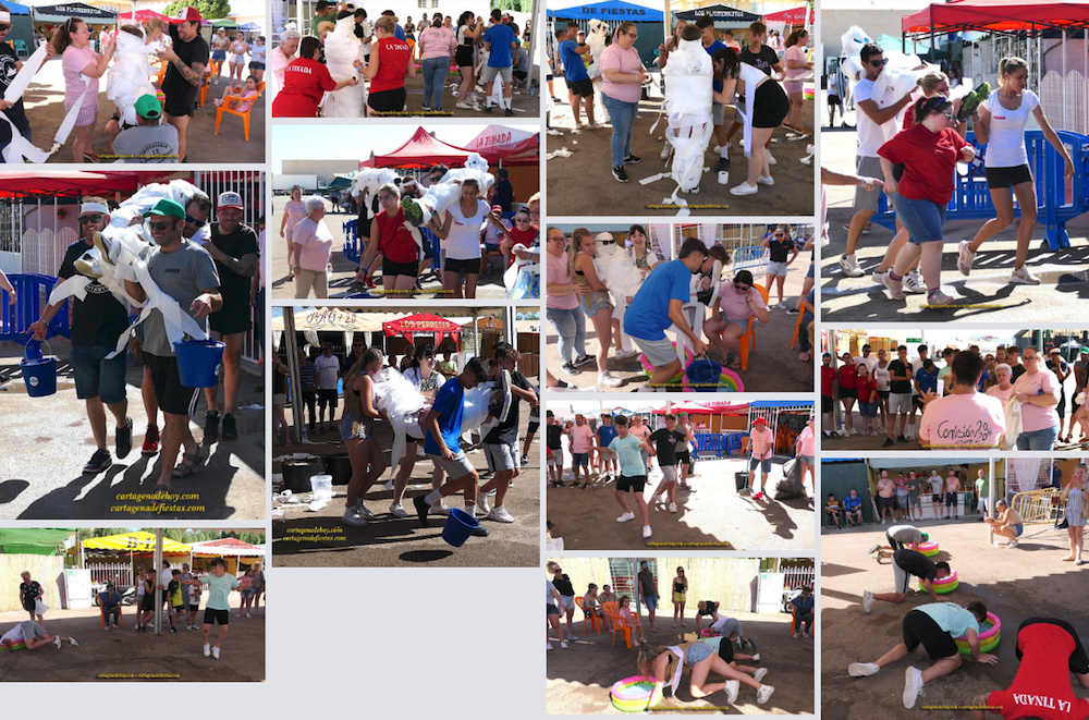 Lo primero fue envolver en papel higiénico a cuatro jóvenes, pues no hay juego sobre Egipto que se precie si no tiene momias. Luego, sus compañeros lo subían a hombros y debían dirigirse a recoger cubos de agua, que después echaban en pequeñas piscinas de plástico, ganando el primero que las llenaba. Luego hay que descifrar un jeroglífico, pero en situación complicada. A cada participante se daban tres vueltas sobre sí mismo y luego corría (haciendo 'el egipcio' con las manos) hacia barreños con tapones que llevaban letras, los cuales debían recoger con la boca y llevarlos al punto de partida. Siguieron las pruebas. Pinatarse un objetivo conseguir regalos, obtener anillos de boda y bailar.