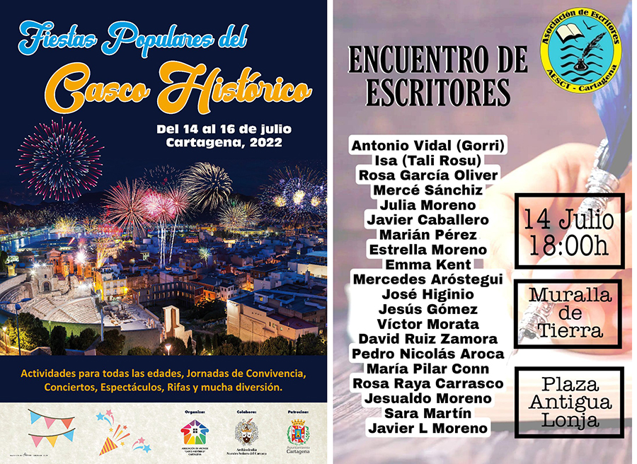 El punto de partida de hoy es un encuentro organizado por la Asociación de Escritores de Cartagena (AesCt), con exposición de libros y presencia de autores. Por la noche tendrá lugar, en el mismo lugar, el pregón de apertura, que lo ofrecerá Noelia Arroyo.