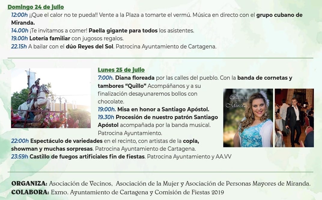 Hoy, domingo, hay un vermú a ritmo cubano en la plaza del local social, que derivará en una invitación para todos los asistentes a un arroz gigante. Por la tarde, rifa familiar y baile. Mañana acaban los festejos con el gran día en honor al patrón.