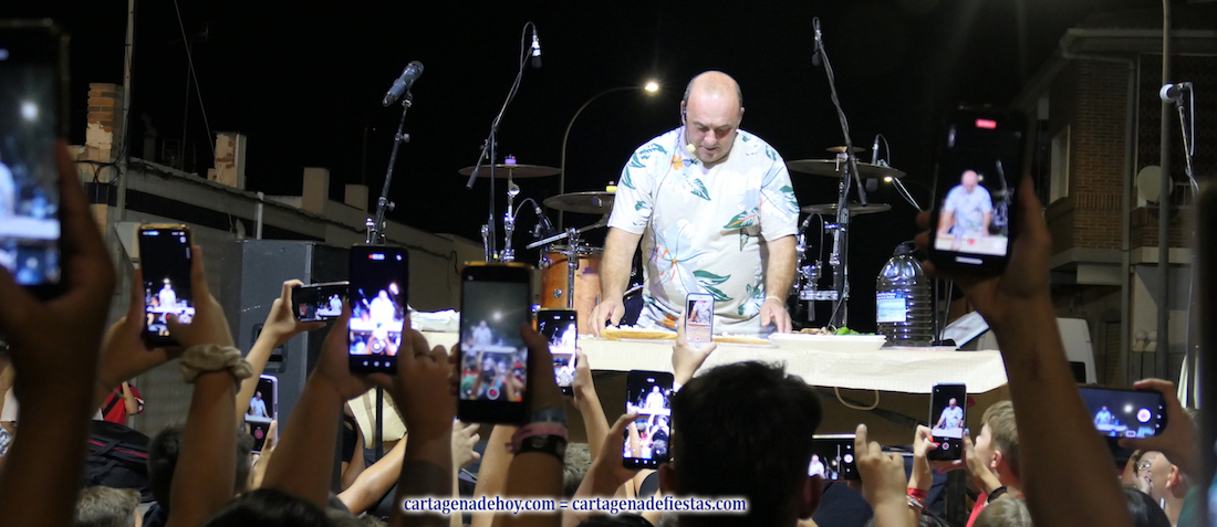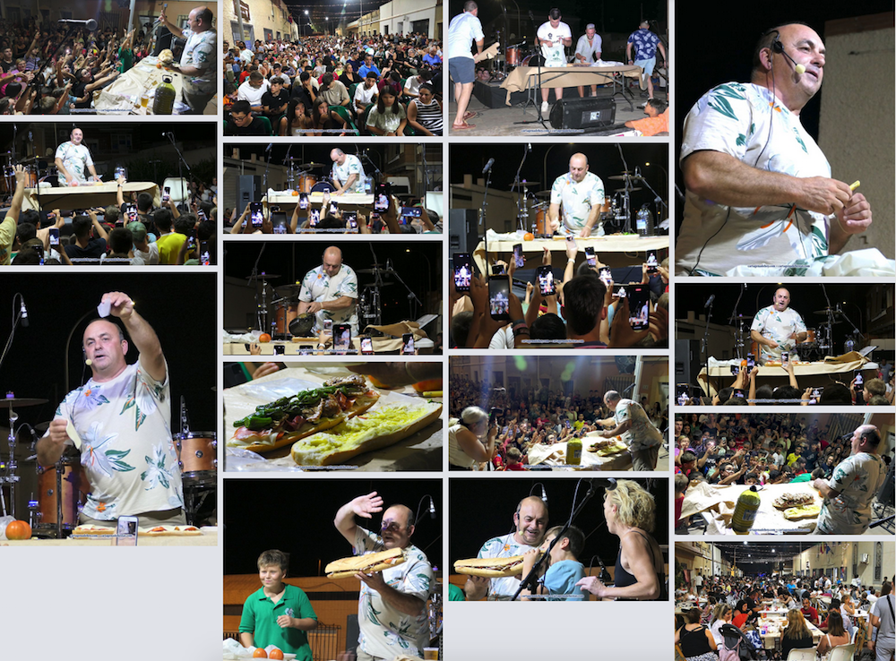 El bocadillejo que hizo era muy apetitoso, pues llevaba aceite ("¡Que empape!"), tomate, queso, jamón, pimientos y lomo. Dos chavales y una mujer fueron los que lo probaron subiendo al escenario. Después, Ginés anunció que se fotografiaría con todo el que quisiera, lo que hizo. Fue la noche en que descubrimos que en este mundo en el que vivimos todo es posible de viralizarse.
