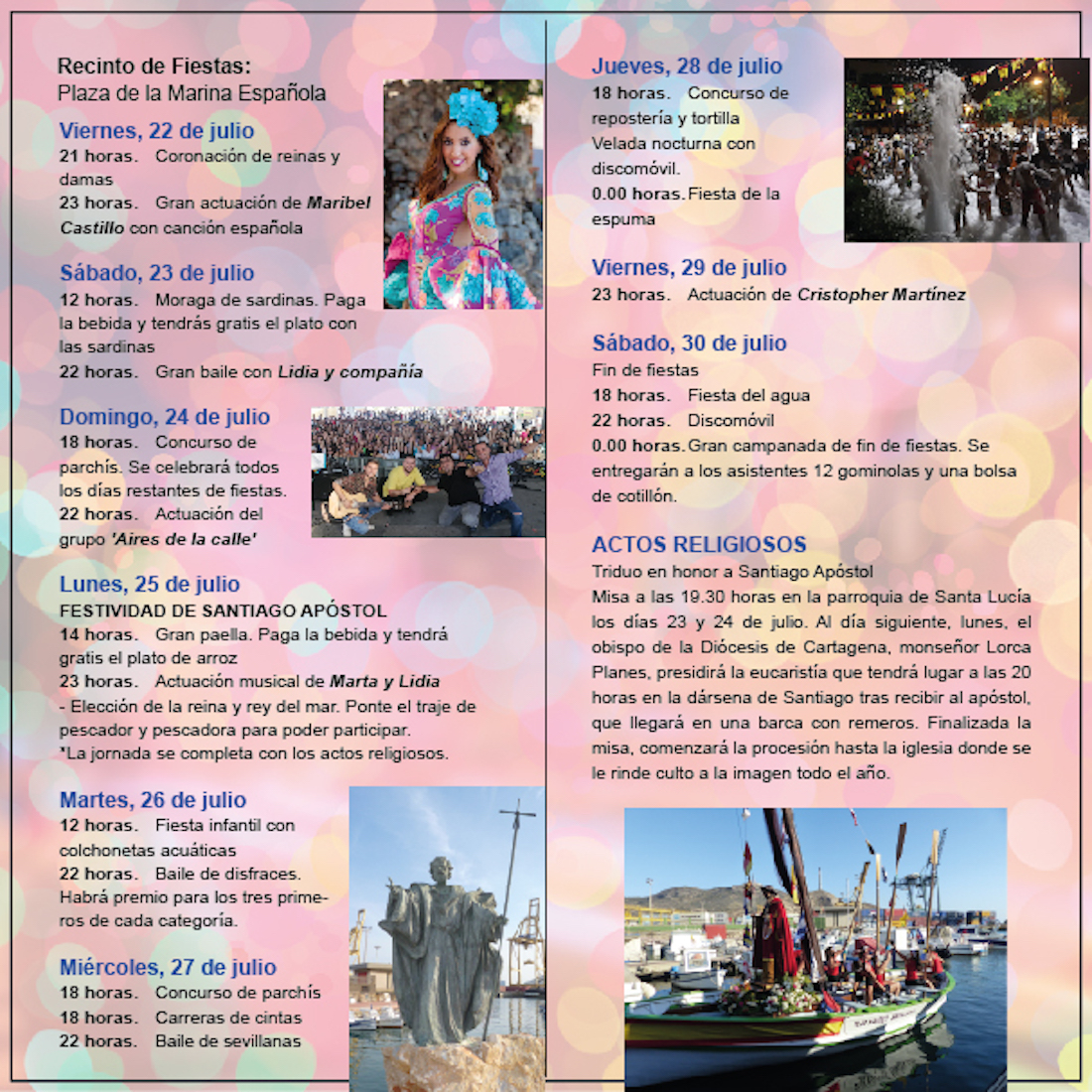 Las fiestas en la villa y condado celebran hoy el día de Santiago Apóstol. A las 14 horas hay arroz gratis (pagando la bebida) para los que acudan a la plaza de la Marina Española. Por la tarde, el patrón llegará por mar a la dársena que lleva su nombre, donde se celebrará una misa oficiada por el obispo de la Diócesis de Cartagena. Por la noche, baile y elección de 'los reyes del mar' en el recinto de fiestas.