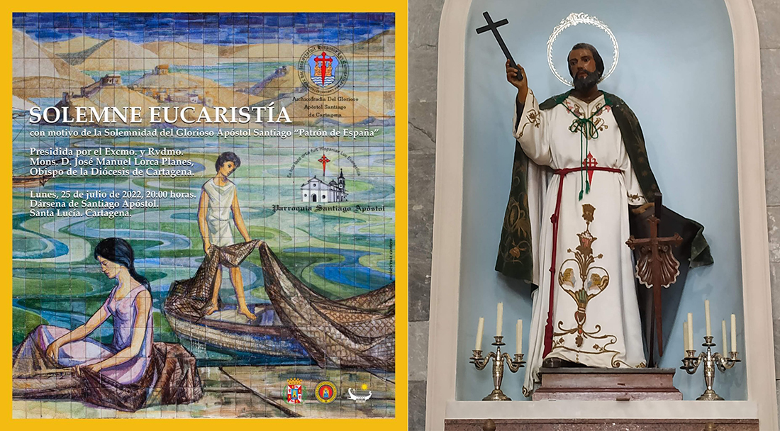 Misa a las 19.30 horas en la parroquia de Santa Lucía los días 23 y 24 de julio. Al día siguiente, lunes, el obispo de la Diócesis de Cartagena, monseñor Lorca Planes, presidirá la eucaristía que tendrá lugar a las 20 horas en la dársena de Santiago tras recibir al apóstol, que llegará en una barca con remeros. Finalizada la misa, comenzará la procesión hasta la iglesia donde se le rinde culto a la imagen todo el año.