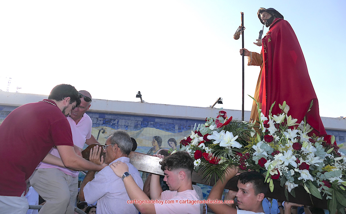 Junto al mural que representa la llegada de Santiago de Zebedeo o Santiago El Mayor a Hispania en el siglo I por aguas de Carthago Nova, tuvo lugar la eucaristía presidida por el obispo de la Diócesis de Cartagena, monseñor Lorca Planes, quien estuvo arropado por el vicario de Cartagena, José Abellán, y por el párroco de Santa Lucía, Ángel Obradors, participando también otros sacerdotes.