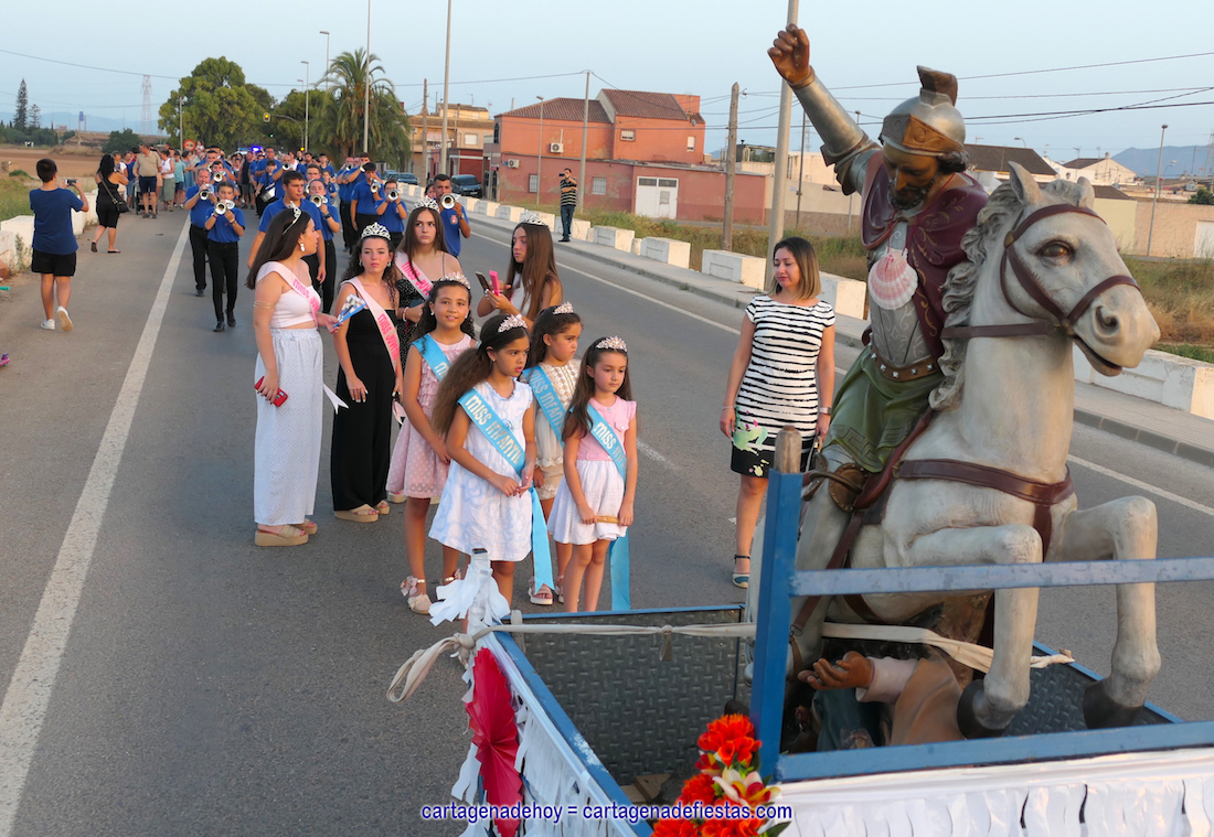 La imagen ecuestre del apóstol volvió a salir de su templo después de tres años, debido al parón pandémico, para presidir la misa de campaña que tuvo lugar en la plaza de la barriada que lleva su nombre y recorrer el núcleo de población del que es patrono acompañado por el sonido de ‘Los guardianes del redoble’. GALERÍA DE FOTOS (pinchar aquí)