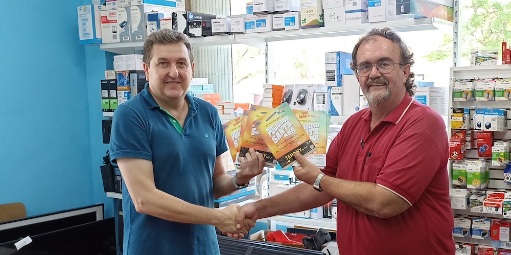 Han sido 1.500 los ejemplares distribuidos, además de 750 folletos con la programación, de los festejos que tendrán lugar del 1 al 4 de septiembre en la barriada, en lo que será, además, una gran cita musical, pues actuarán hasta diez bandas distintas. En la imagen, el presidente de la comisión organizadora, Cayetano García, entrega, en el comercio de Informática Ode 24, ejemplares a Cartagena de Hoy como periódico referencia de las fiestas del municipio.