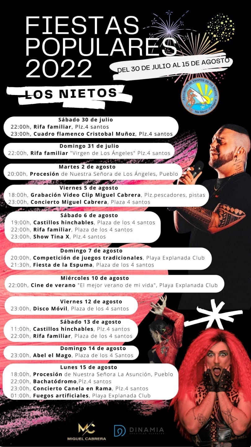 Nuestra Señora de los Ángeles recorrerá el pueblo marmenorense en la tercera jornada de unos festejos populares que comenzaron con el cuadro flamenco de Cristóbal Muñoz (foto adjunta) y que se prolongarán hasta el 15 de agosto, cuando desfile Nuestra Señora de la Asunción.
