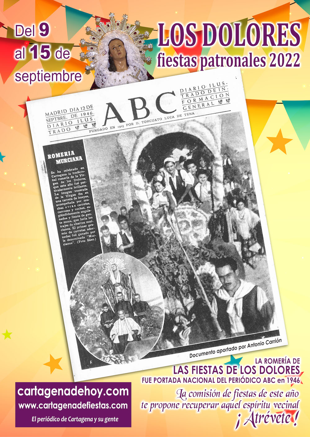 El dolorense Antonio Carrión Garre descubrió un ejemplar del diario ABC de fecha 12 de septiembre de 1946 en el que la romería de la Virgen de los Dolores del populoso barrio cartagenero era portada nacional con dos fotografías de su celebración. Ese documento ha sido la base de la imagen oficial que recorrerá el barrio para anunciar los festejos, que este año tendrán lugar del 9 al 15 del próximo mes. Cartagena de Hoy y Artes Gráfica Cervantes han colaborado en el diseño y en la impresión, observándose en la imagen al director del periódico, Carlos Illán, entregando los carteles a Adela Gutiérrez, de la comisión de fiestas, en presencia de Carrión.