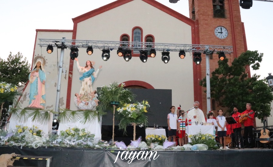 Tras la intensa madrugada, Alumbres hizo un alto festero el lunes 15 de agosto, para por la tarde, sobre las seis y media, comenzar el sonido a recorrer las calles, siendo esta vez la banda de cornetas y tambores de Diego García el grupo encargado de recoger a la corte de honor para la ofrenda floral que tuvo lugar ante la fachada de la iglesia en un acto dirigido por el párroco, Andrés Vera, y amenizado por un coro rociero, destacando también la participación de la Asociación Cultura Modernistas de Levante de Cartagena.