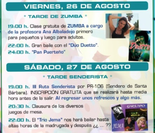 El programa oficial arrancará el próximo sábado, 27 de agosto, con el ‘Día del hombre’, en el que se realizará un almuerzo a las 12 horas. Por la noche, baile en la verbena con la actuación de trío Jema, a partir de las 22 horas.