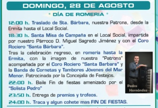 El domingo 28 de agosto, a las 12 horas, se llevará a cabo el baile del vermú, que estará amenizado por Paco Palbidia. A las 22 horas, continuará la danza y los asistentes podrán ver la actuación del dúo Sonora.