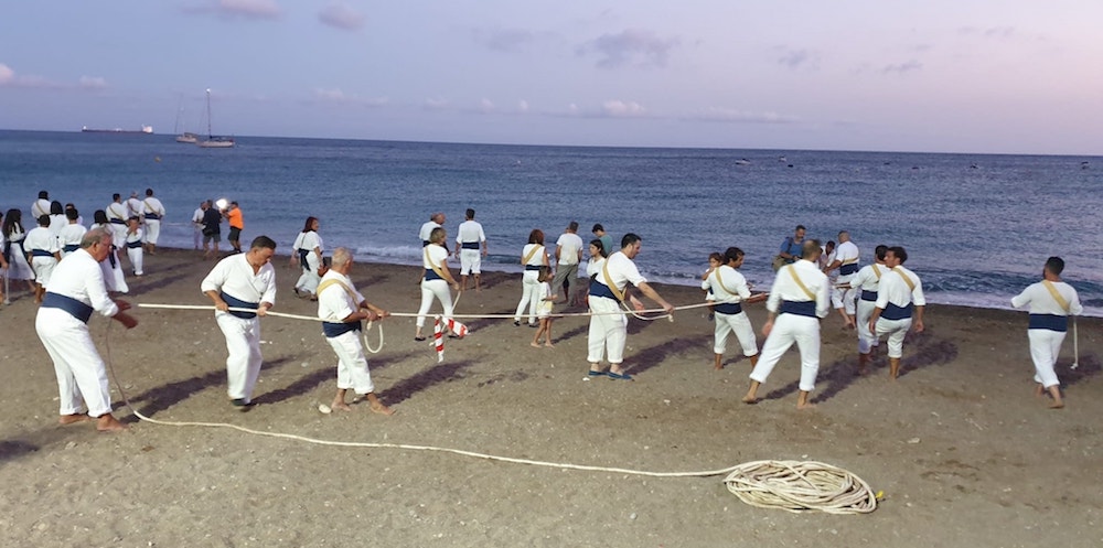 La actividad en torno a la XI edición de ‘Portusium Jábega 2022’ comenzó ants con una misa marinera en la ermita y tras la captura de peces, se celebró una moraga de sardinas, para en la medianoche comenzar un concierto de música con lotería familiar en sus descansos.