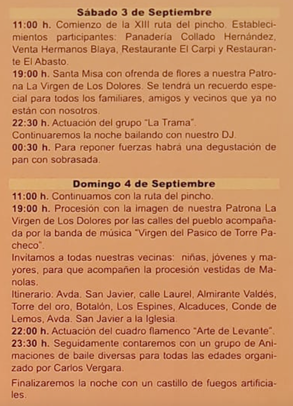 Después, Juani informó desde el escenario a los asistentes que este domingo se llevará a cabo un homenaje a aquellas personas que han tenido alguna función dentro de las procesiones celebradas con la Virgen de la Caridad en el pueblo. La relación de esta edición es la formada por doce personas: Pedro Martínez Garre, Alfonso Conesa Martínez, Pedro Lloris Roca, José García Campos, José Martínez Aparicio, Luis Gregorio Martínez Hernández, Vicente Martínez Pérez, José Antonio Nicolás Sabater, Santiago Nicolás Sabater, Ángel Bernal Albaladejo, Francisco Esparza Saura, María Teresa Roldán Soriano y Valentina García Martínez. Añadió que si alguien conoce a más personas que tuvieran funciones asignadas en la procesión, lo indique a la comisión, pues la ideas es institucionarlizar este homenaje en los próximos años. También pidió la colaboración de vecinos para la bajada de la Virgen esta tarde en la iglesia.