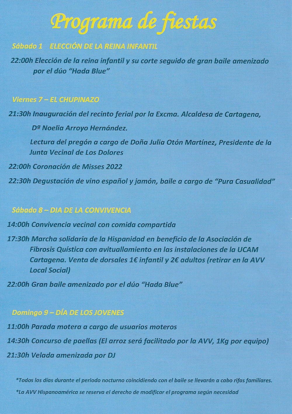Las fiestas eligieron el pasado sábado a sus seis niñas que tendrán los cargos de mises y este viernes serán coronadas, en una velada en la que la alcaldesa está previsto que inaugure el recinto de fiestas y en el que pronunciará el pregón Julia Otón Martínez, presidenta de la Junta Vecinal Municipal de Los Dolores y vecina de esta población.