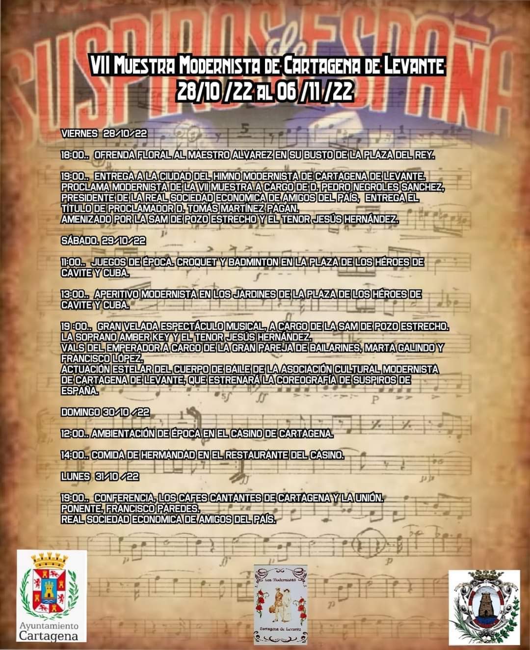 El programa de la séptima edición que organiza durante diez días la asociación cultural Modernistas de Levante de Cartagena se activa hoy con la ofrenda floral al Maestro Álvarez (18 horas), la entrega a la ciudad del ‘Himno modernista’ (19 horas) y la proclama a cargo de Pedro Negroles, en un acto que tendrá lugar en la glorieta de San Francisco amenizado por la Sociedad Artístico-Musical ‘Santa Cecilia’ de Pozo Estrecho y el tenor Jesús Hernández. El sábado serán protagonistas los deportes y la música.