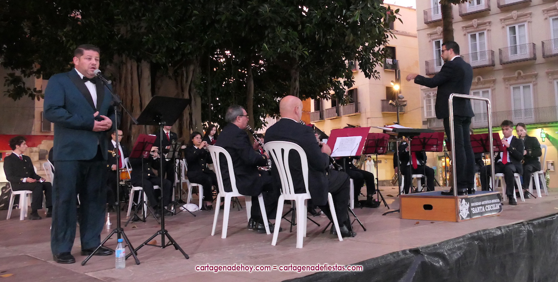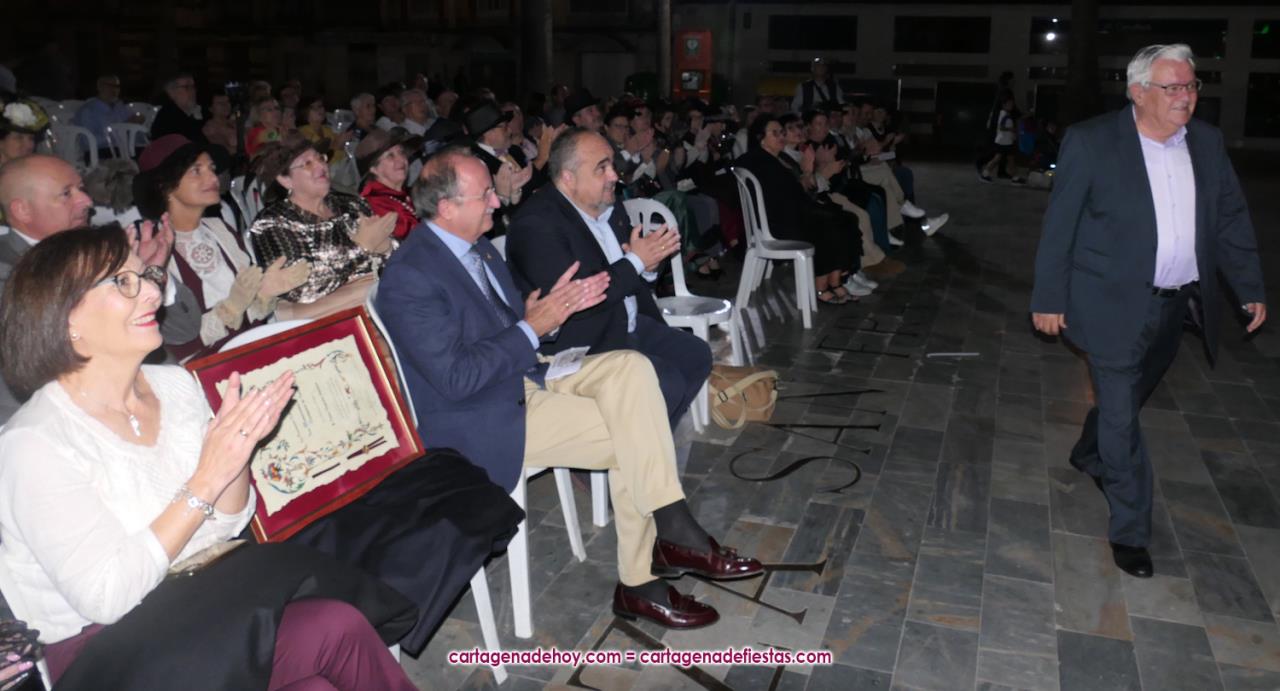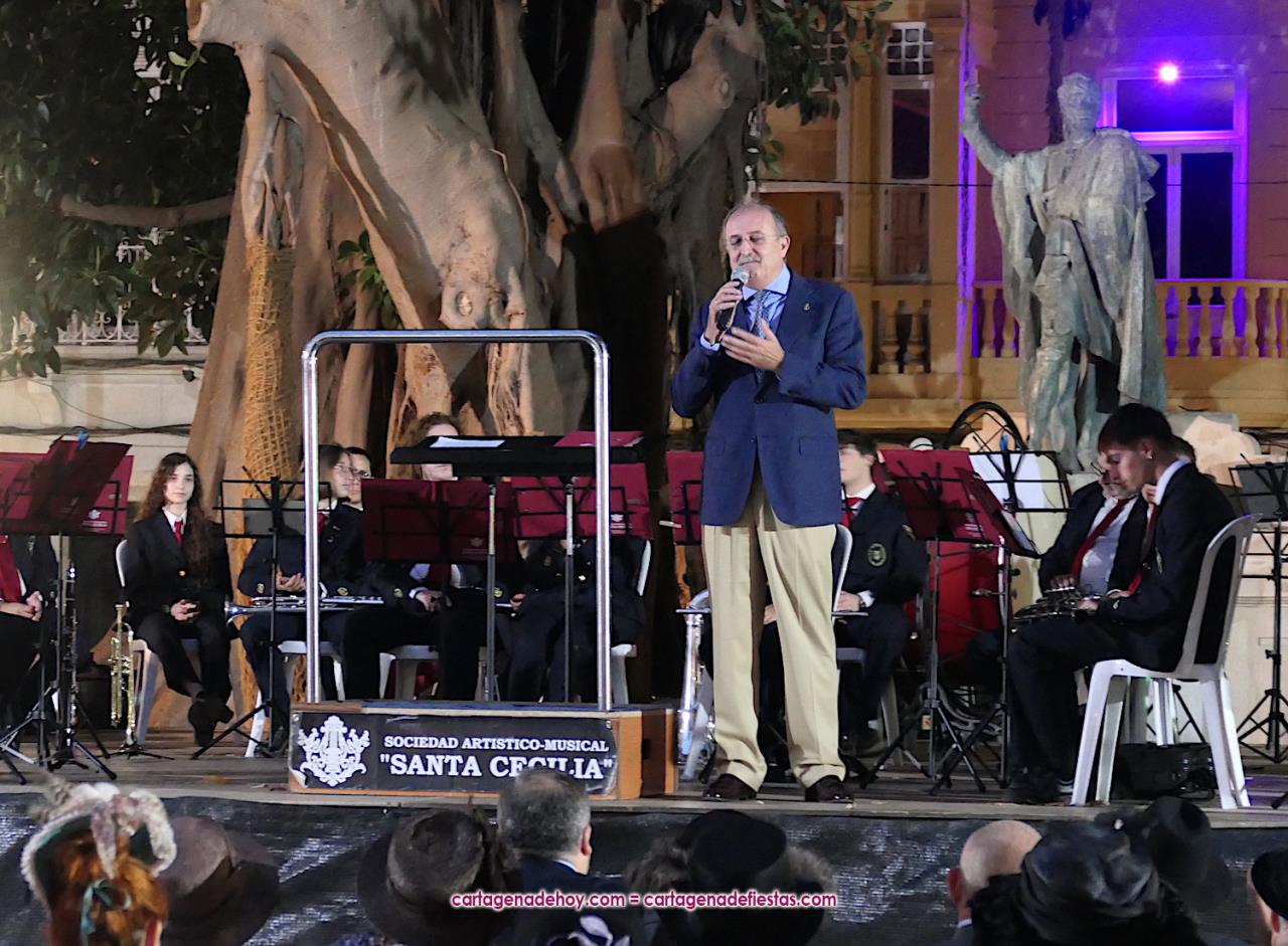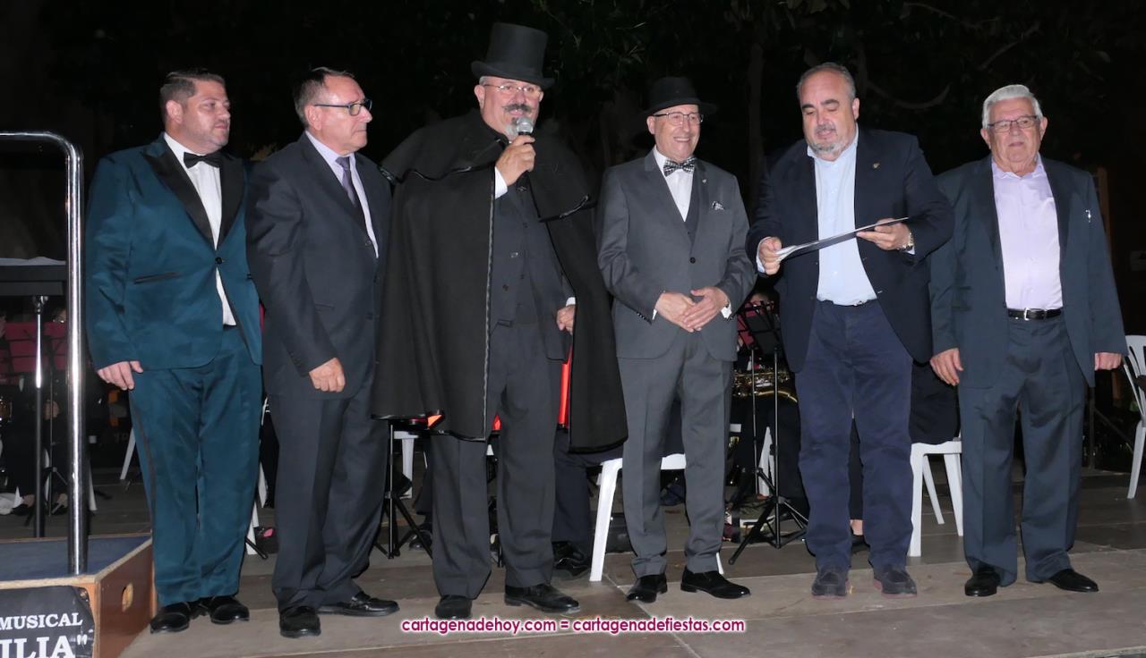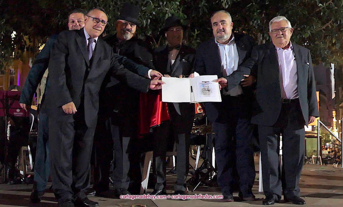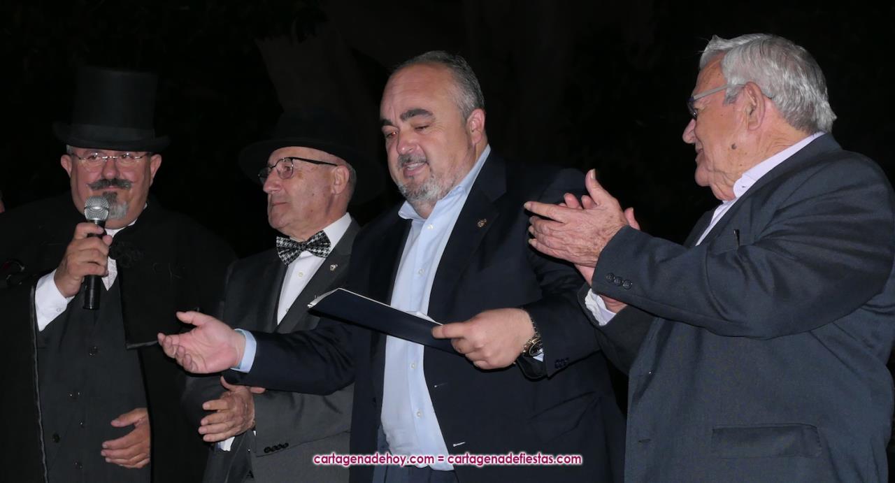 Tras terminar la pieza la Sociedad Artístico Musical ‘Santa Cecilia’ de Pozo Estrecho y el tenor Jesús Hernández, tomó la palabra José Antonio Martínez ‘El Kachimanero’, presidente de los modernistas cartageneros, quien, tras apuntar que Cartagena “tiene un gran patrimonio con el modernismo que poco se valora”, expuso algunas líneas a destacar de lo que han preparado para esta muestra, especialmente, el café-cantante ‘La modernista’. También llevó a cabo la entrega del carné de ‘socio de honor’ (la primera vez que lo recibe un político) al concejal de Festejos, Juan Pedro Torralba, por su apoyo a las siete muestras celebradas. “Gracias al concejal y un abrazo al amigo”, expresó el presidnte.