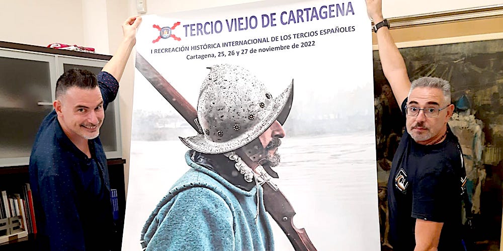 Es una de las actividades del programa de la primera edición de la ‘Recreación histórica internacional de los tercios españoles’ que tendrá lugar en Cartagena del 25 al 27 de este mes y cuyo cartel oficial diseñado por Ángel Maciá es el que muestra la imagen con el edil Carlos Piñana.