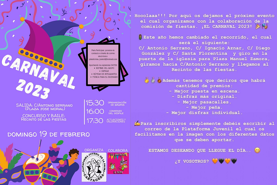 La peña 'Los arrebataos' ofrece este sábado en la carpa festera, en el arranque de las fiestas patronales, el monólogo de José Vila y la chirigota 'Los robinsones de La Isla', mientras que el domingo es para el XV Trofeo 'Atún de oro' que organiza el club ciclista, mientras que la plataforma juvenil es la organizadora del desfile carnavalero esa tarde con unas quinientas personas de 21 grupos locales y el invitado de los cabezudos de Torre Pacheco.