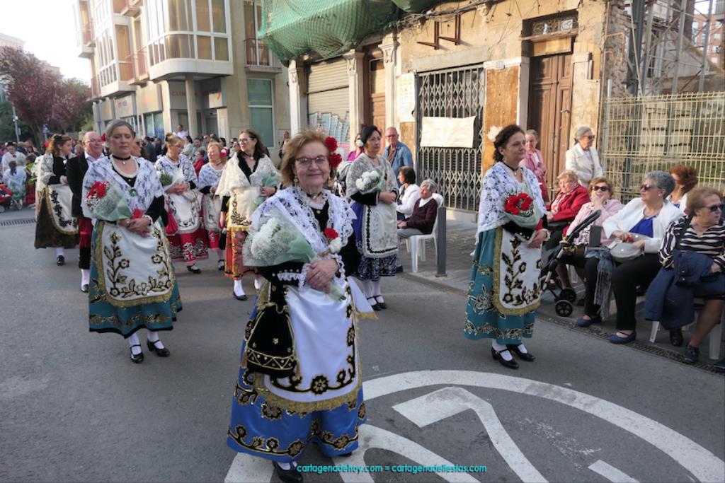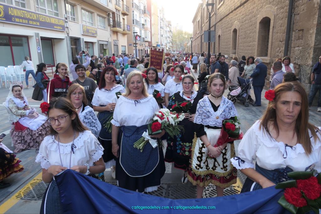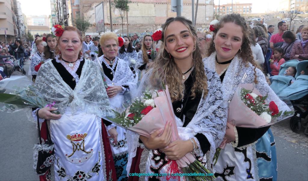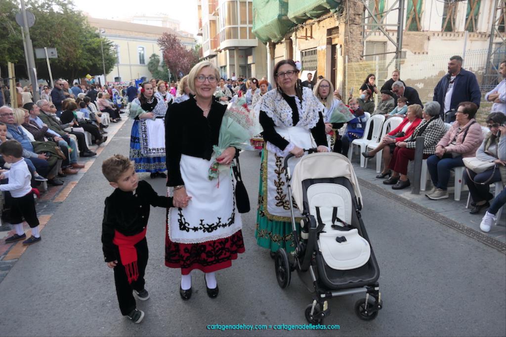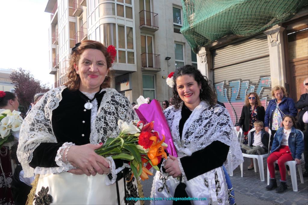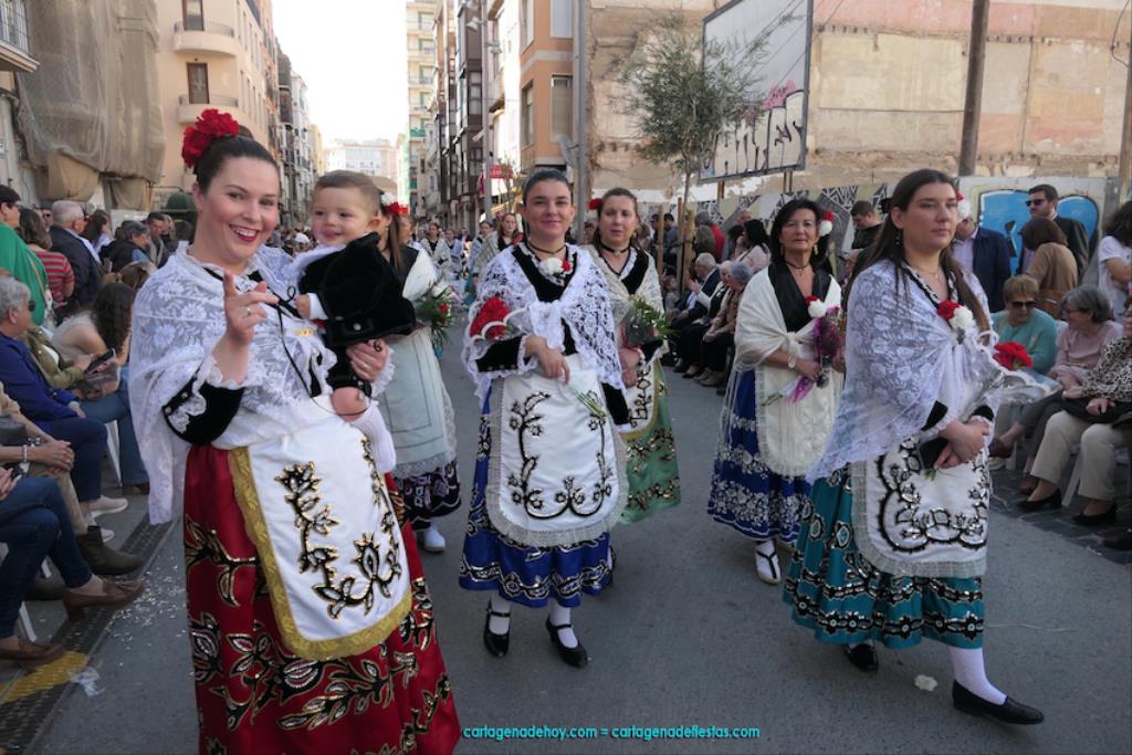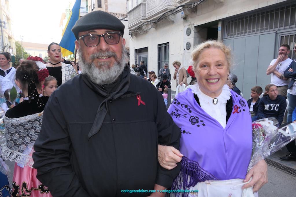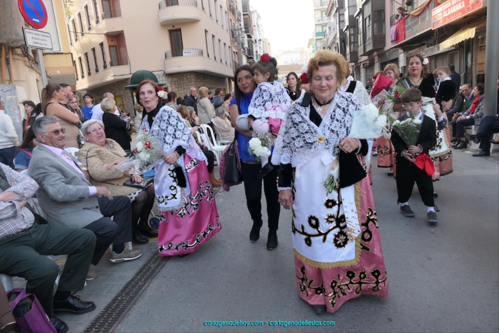 Isabel es un ejemplo de la devoción que existe hacia la patrona y a buen seguro que habrá más casos similares. Así, por ejemplo, Ana de Haro, presidenta vecinal del Ensanche-Almarjal, supera las cuatro décadas de ofrendas. En la lado opuesto hemos podido ver a muchos bebés con escasas semanas, meses o años de vida, y entre medio, un amplio ramillete de edades.Han sido cincuenta los grupos que ha protagonizado el mayor desfile popular de Cartagena cada año, que son los que aparecen en la relación adjunta más el partido 'Sí Cartagena'. También figura MC, con los ediles María José Soler y Jesús Giménez, entre otros de su formación, portando un escudo floreado de Cartagena, mientras que José López iba con la Cuarentuna. Otro candidato a alcalde, el socialista Manuel Torres, por su parte, llevaba el ancla que abría paso al grupo de vecinos de Santa Lucía, con amplia presencia de pescadoras. Por su parte, el gobierno municipal ha sido el segundo grupo que ha efectuado la ofrenda, con la alcaldesa luciendo típico traje cartagenero, al igual que Diego Ortega.