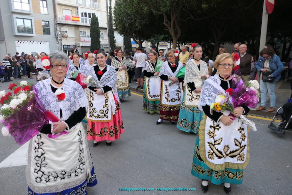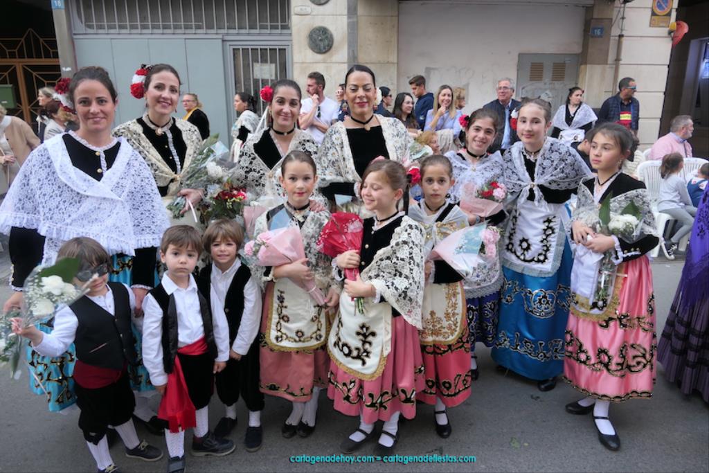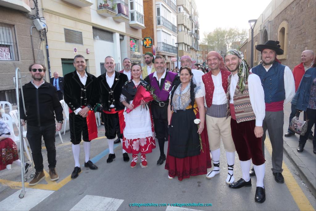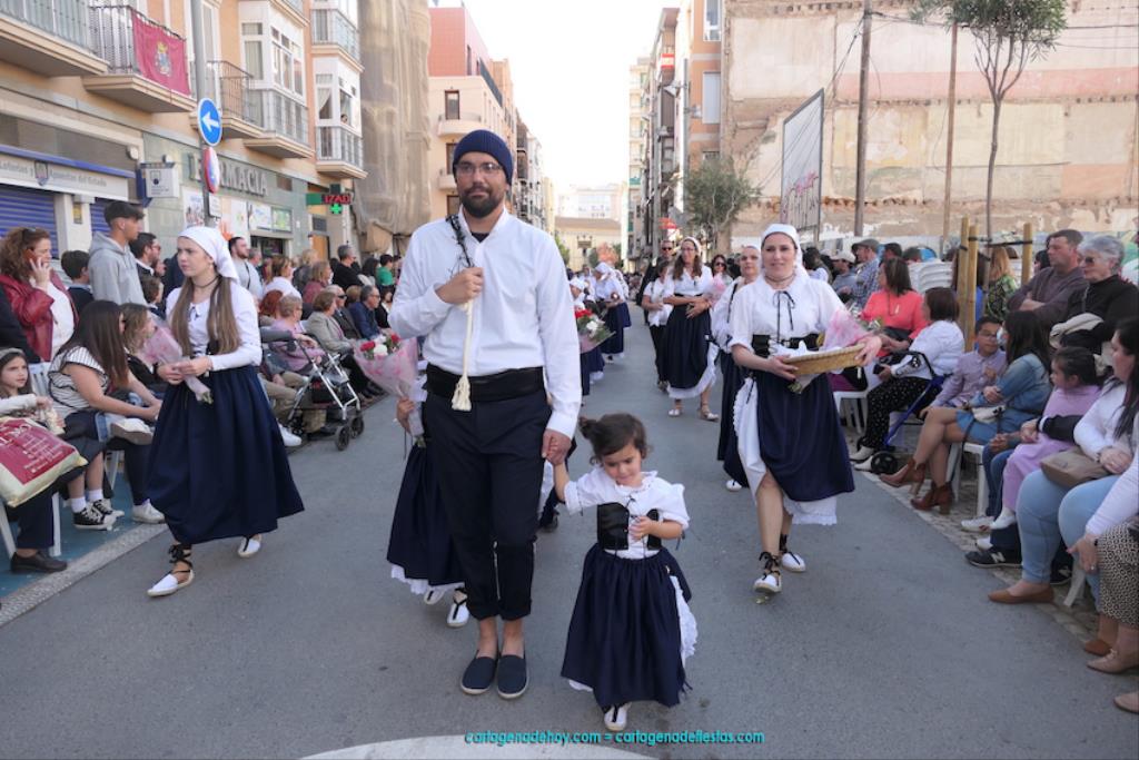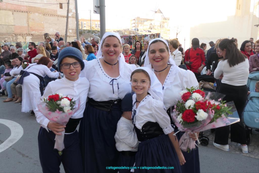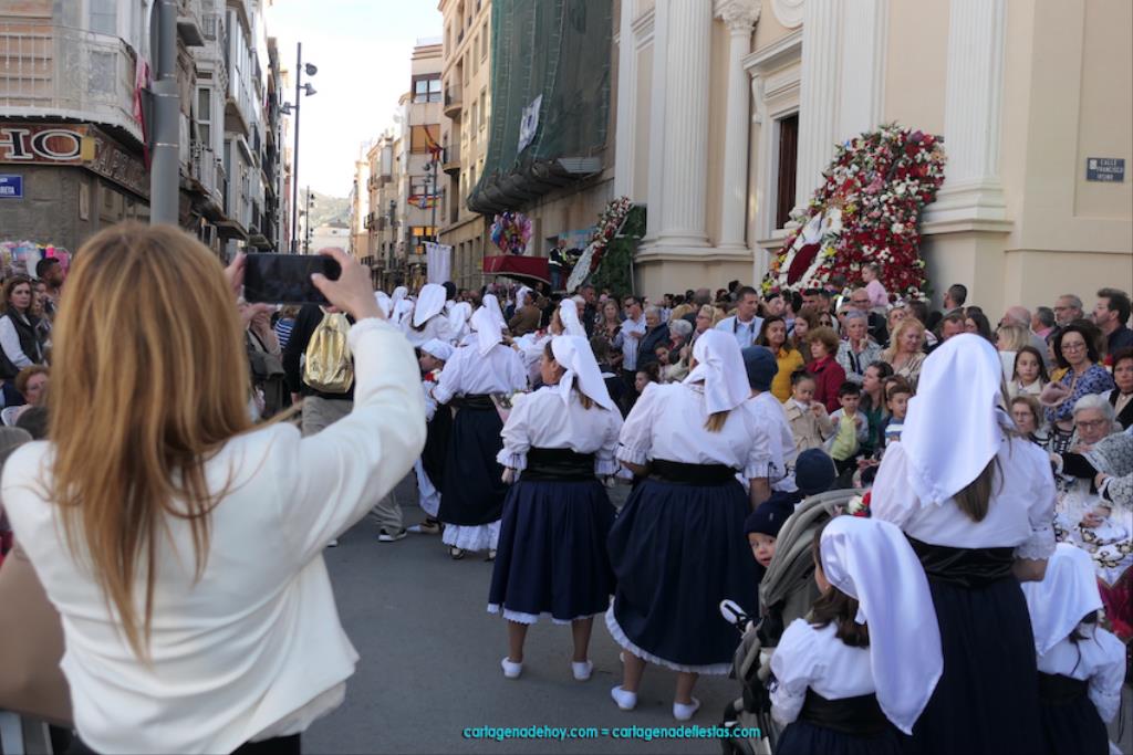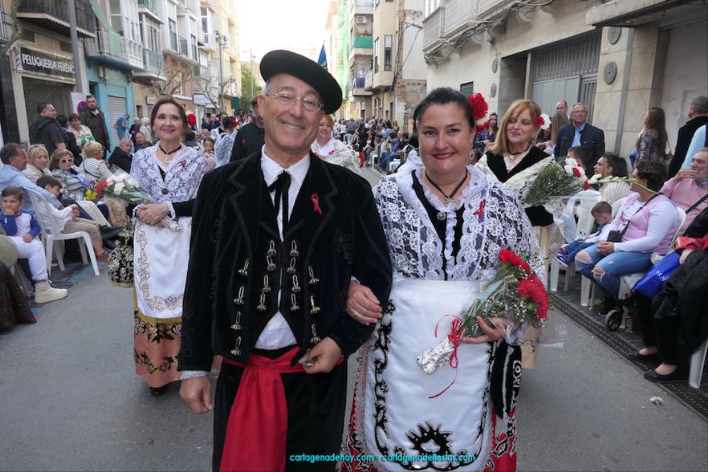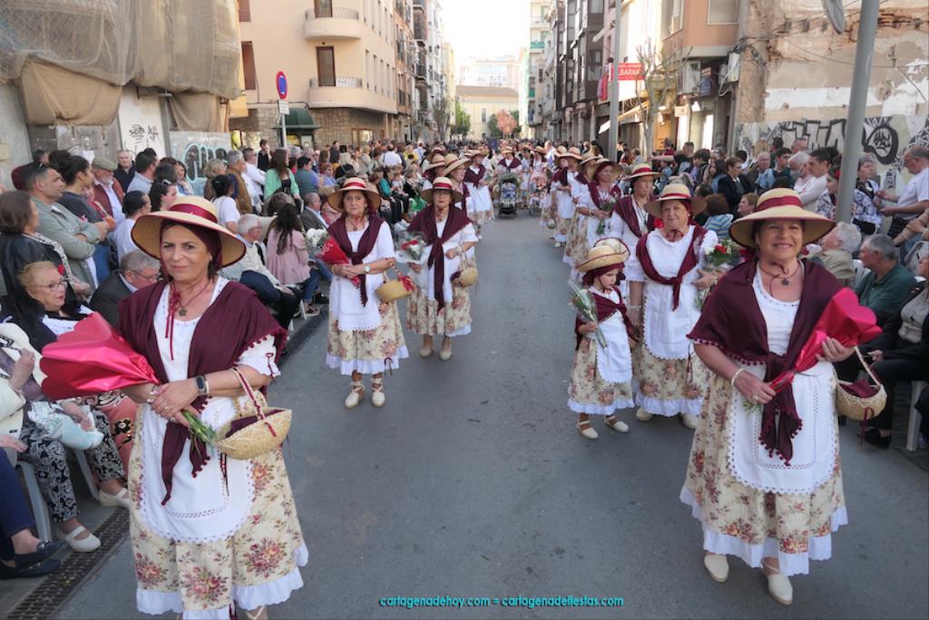 Isabel es un ejemplo de la devoción que existe hacia la patrona y a buen seguro que habrá más casos similares. Así, por ejemplo, Ana de Haro, presidenta vecinal del Ensanche-Almarjal, supera las cuatro décadas de ofrendas. En la lado opuesto hemos podido ver a muchos bebés con escasas semanas, meses o años de vida, y entre medio, un amplio ramillete de edades.Han sido cincuenta los grupos que ha protagonizado el mayor desfile popular de Cartagena cada año, que son los que aparecen en la relación adjunta más el partido 'Sí Cartagena'. También figura MC, con los ediles María José Soler y Jesús Giménez, entre otros de su formación, portando un escudo floreado de Cartagena, mientras que José López iba con la Cuarentuna. Otro candidato a alcalde, el socialista Manuel Torres, por su parte, llevaba el ancla que abría paso al grupo de vecinos de Santa Lucía, con amplia presencia de pescadoras. Por su parte, el gobierno municipal ha sido el segundo grupo que ha efectuado la ofrenda, con la alcaldesa luciendo típico traje cartagenero, al igual que Diego Ortega.