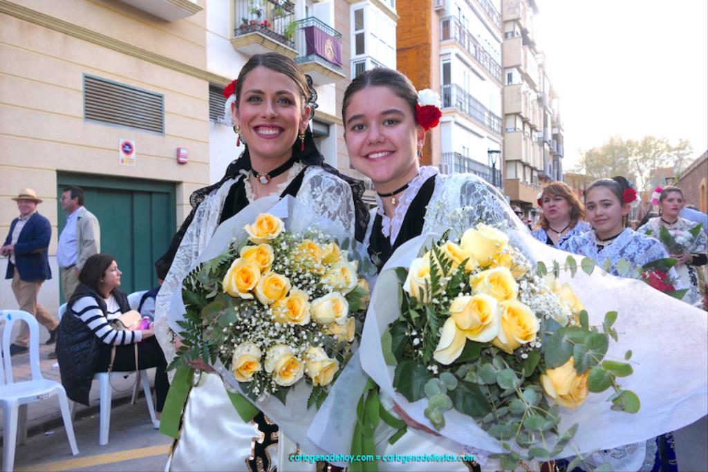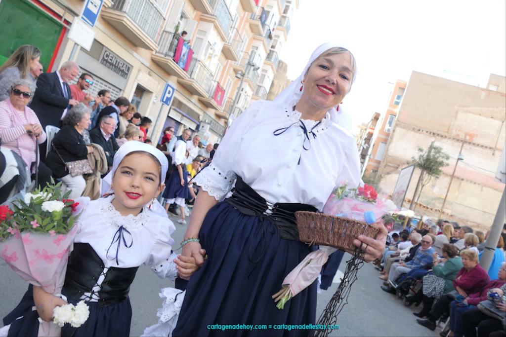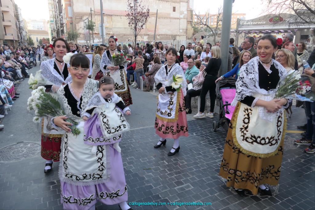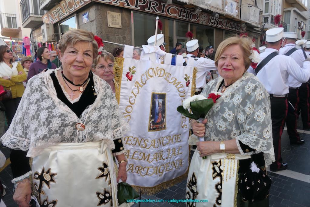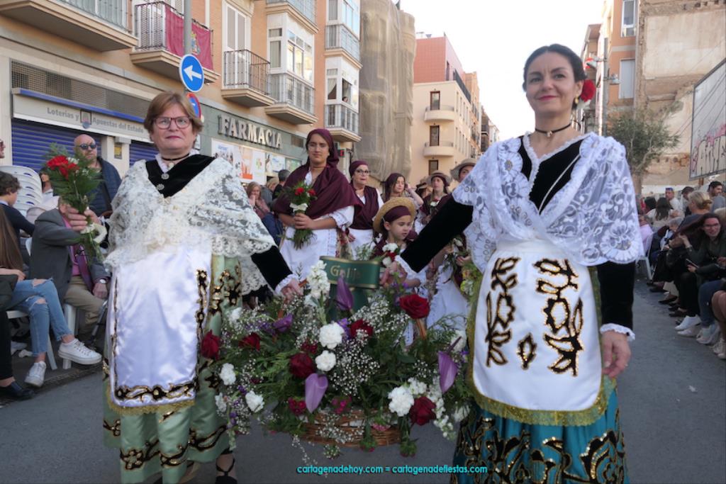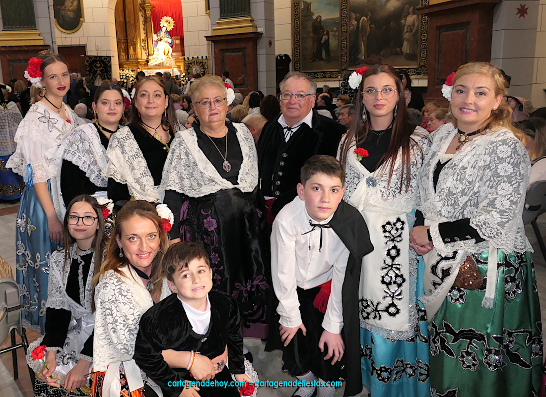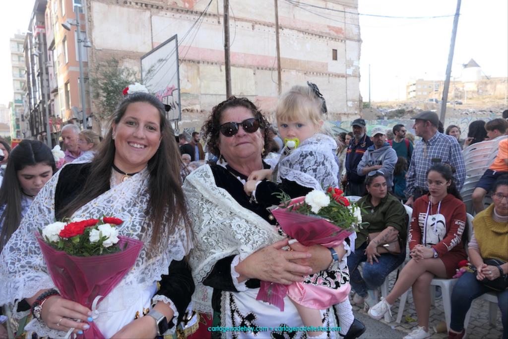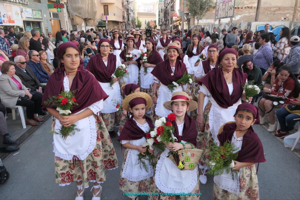 Isabel es un ejemplo de la devoción que existe hacia la patrona y a buen seguro que habrá más casos similares. Así, por ejemplo, Ana de Haro, presidenta vecinal del Ensanche-Almarjal, supera las cuatro décadas de ofrendas. En la lado opuesto hemos podido ver a muchos bebés con escasas semanas, meses o años de vida, y entre medio, un amplio ramillete de edades.Han sido cincuenta los grupos que ha protagonizado el mayor desfile popular de Cartagena cada año, que son los que aparecen en la relación adjunta más el partido 'Sí Cartagena'. También figura MC, con los ediles María José Soler y Jesús Giménez, entre otros de su formación, portando un escudo floreado de Cartagena, mientras que José López iba con la Cuarentuna. Otro candidato a alcalde, el socialista Manuel Torres, por su parte, llevaba el ancla que abría paso al grupo de vecinos de Santa Lucía, con amplia presencia de pescadoras. Por su parte, el gobierno municipal ha sido el segundo grupo que ha efectuado la ofrenda, con la alcaldesa luciendo típico traje cartagenero, al igual que Diego Ortega.