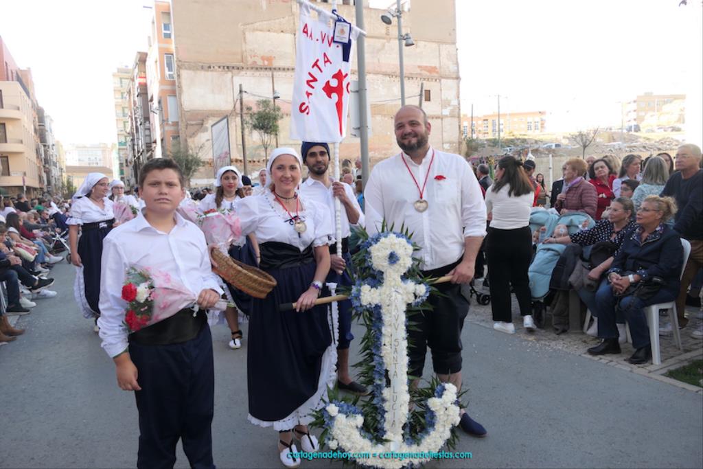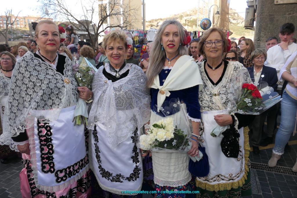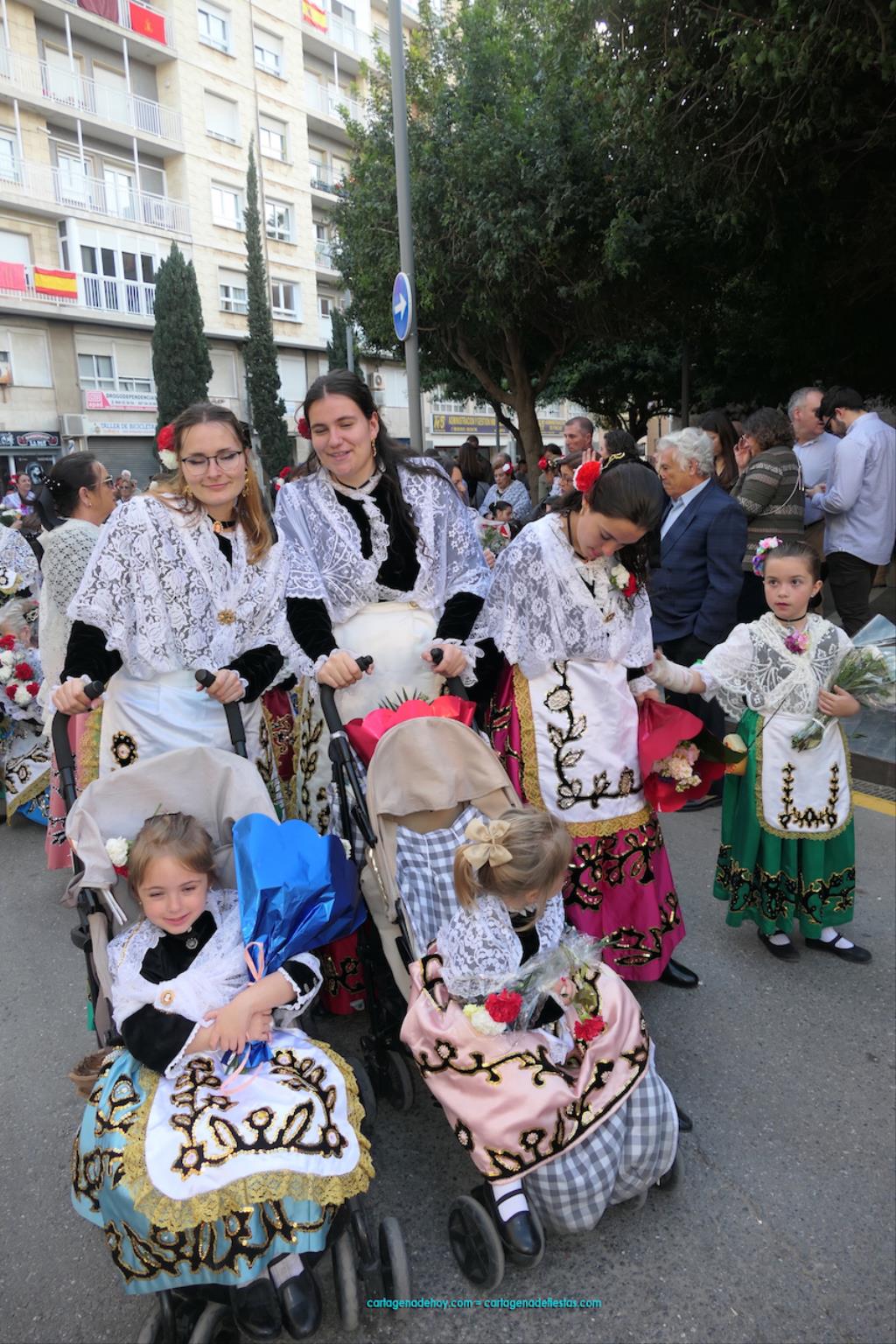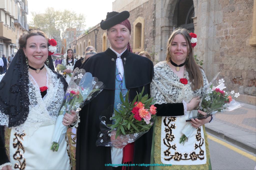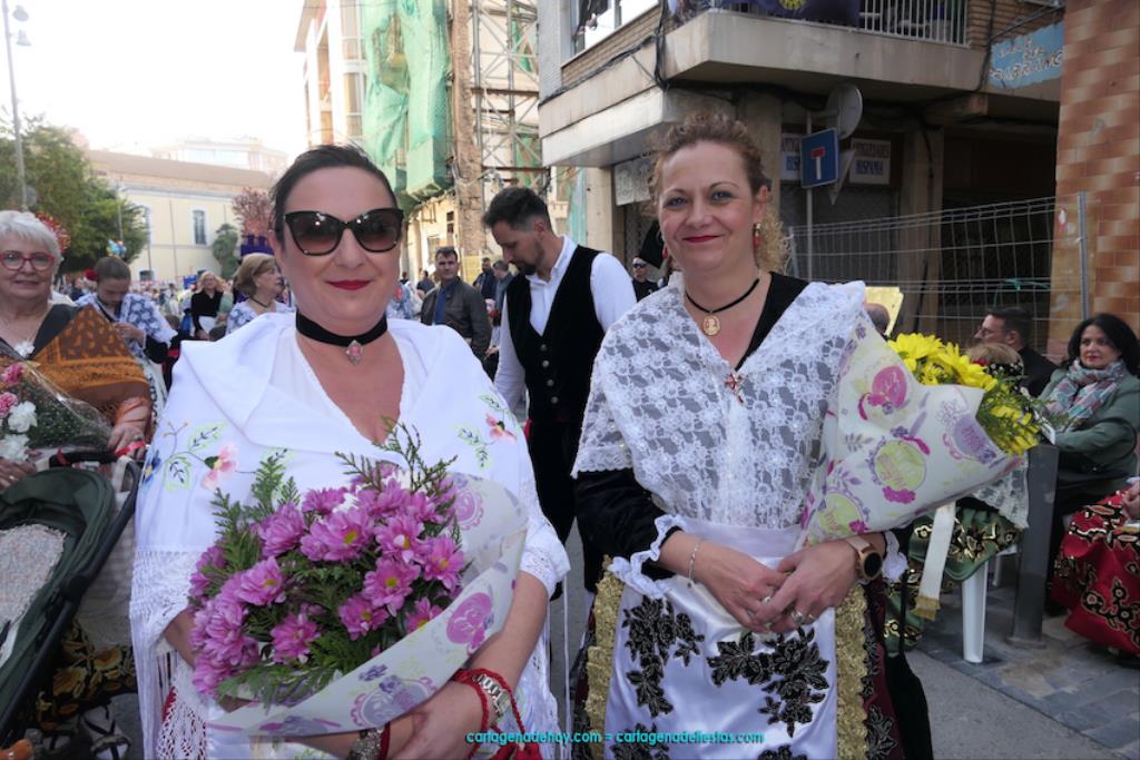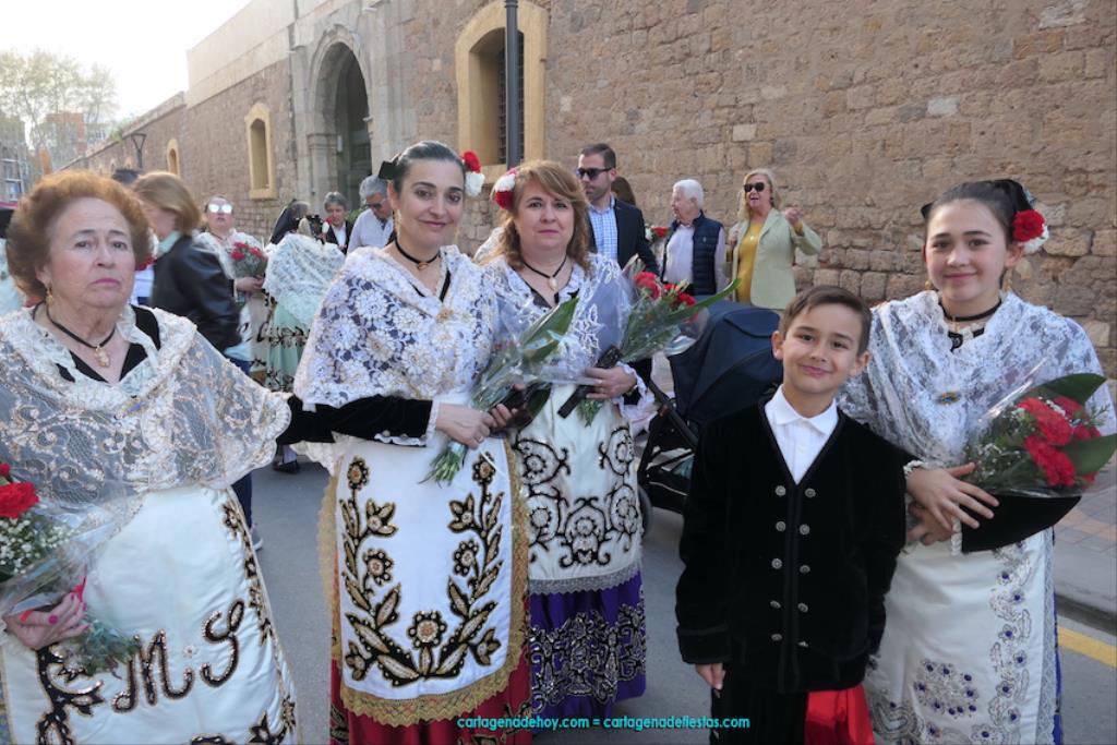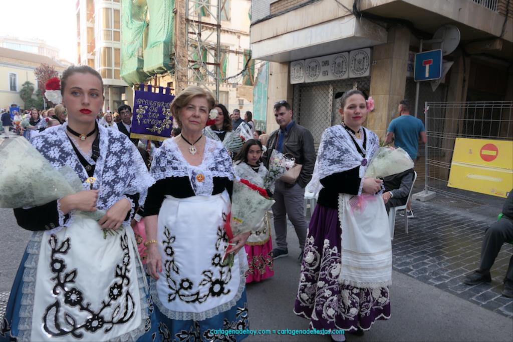Isabel es un ejemplo de la devoción que existe hacia la patrona y a buen seguro que habrá más casos similares. Así, por ejemplo, Ana de Haro, presidenta vecinal del Ensanche-Almarjal, supera las cuatro décadas de ofrendas. En la lado opuesto hemos podido ver a muchos bebés con escasas semanas, meses o años de vida, y entre medio, un amplio ramillete de edades.Han sido cincuenta los grupos que ha protagonizado el mayor desfile popular de Cartagena cada año, que son los que aparecen en la relación adjunta más el partido 'Sí Cartagena'. También figura MC, con los ediles María José Soler y Jesús Giménez, entre otros de su formación, portando un escudo floreado de Cartagena, mientras que José López iba con la Cuarentuna. Otro candidato a alcalde, el socialista Manuel Torres, por su parte, llevaba el ancla que abría paso al grupo de vecinos de Santa Lucía, con amplia presencia de pescadoras. Por su parte, el gobierno municipal ha sido el segundo grupo que ha efectuado la ofrenda, con la alcaldesa luciendo típico traje cartagenero, al igual que Diego Ortega.