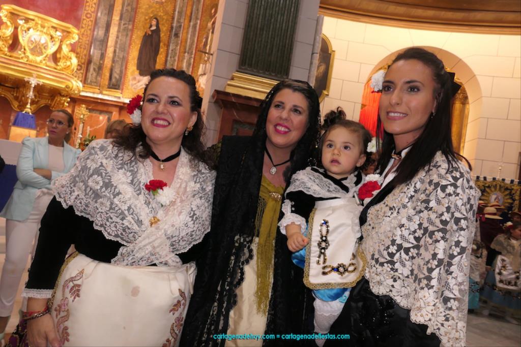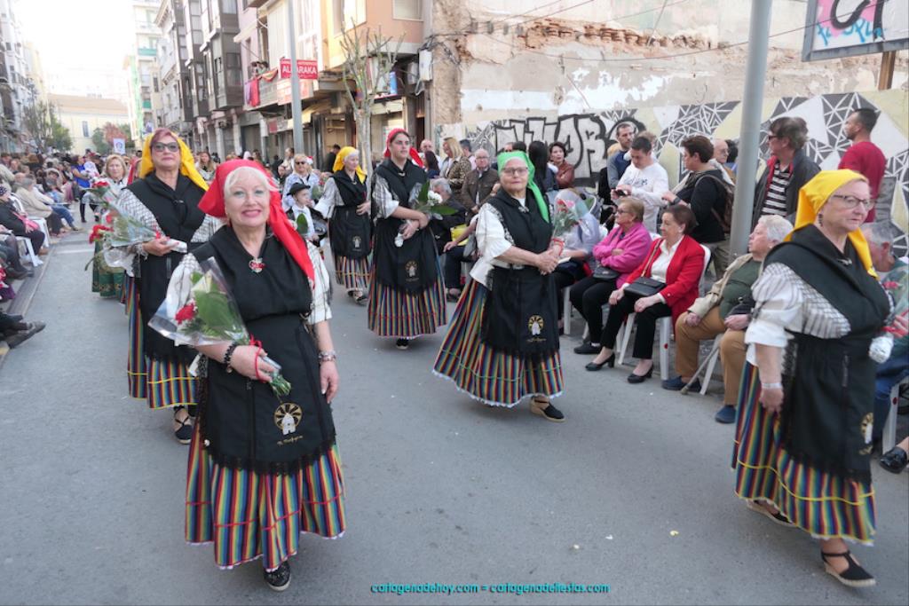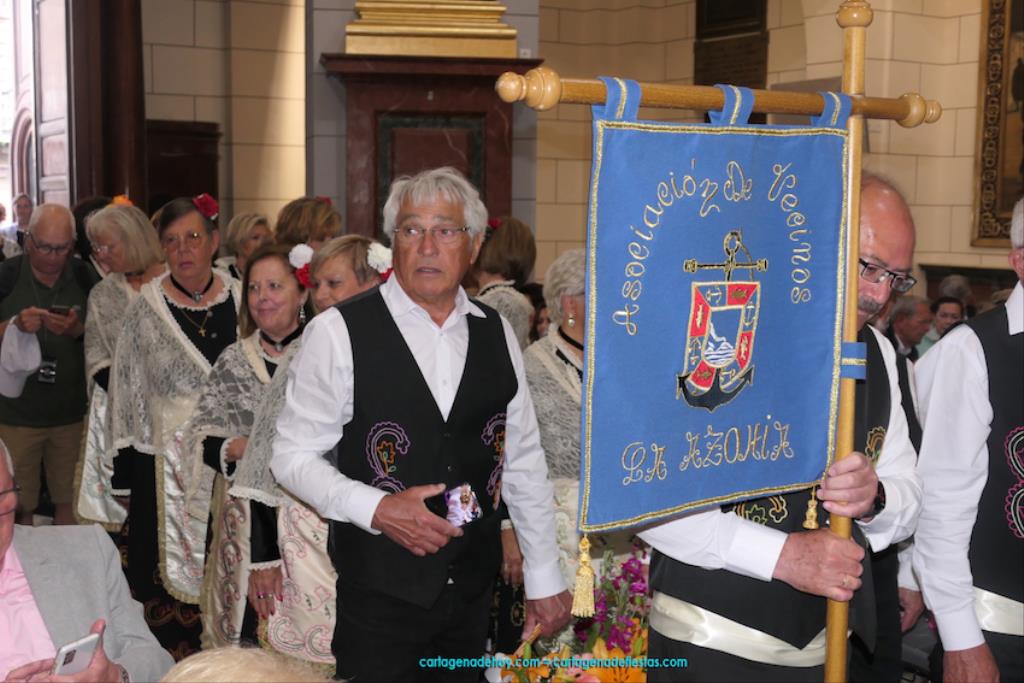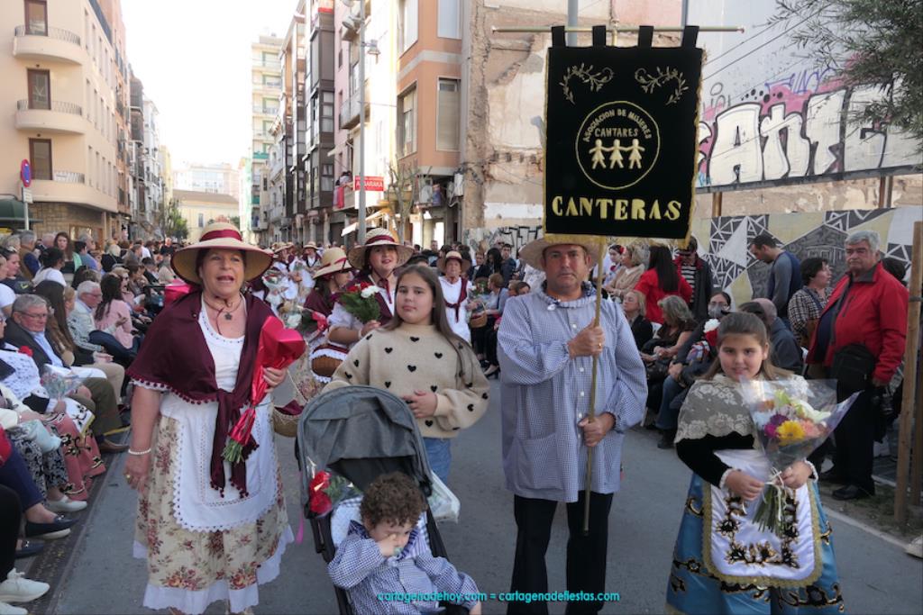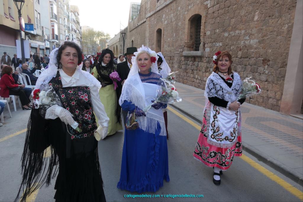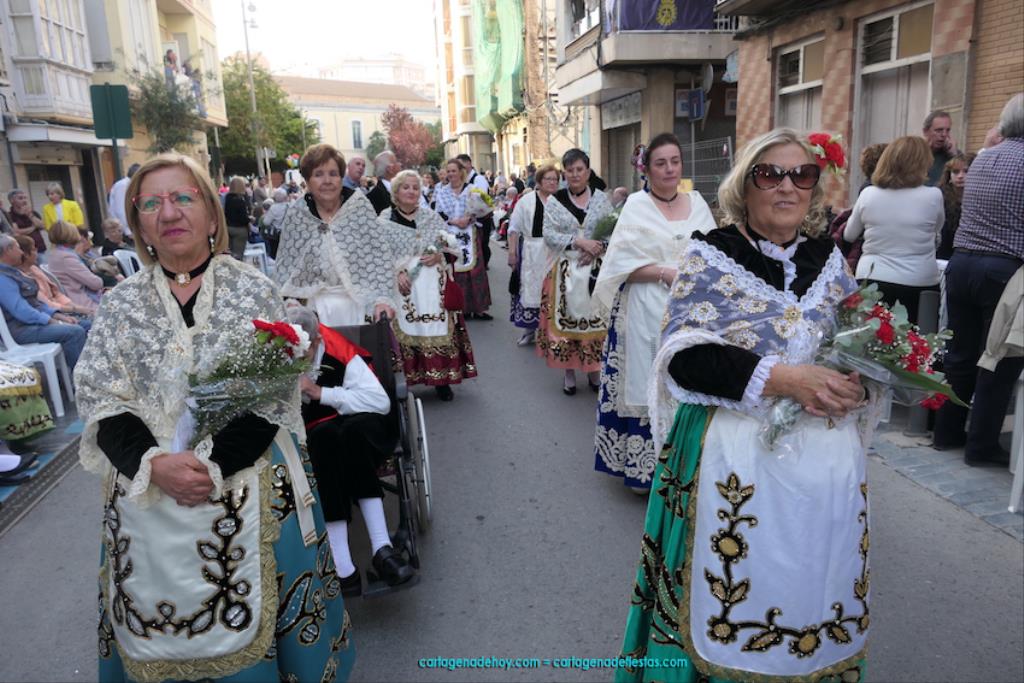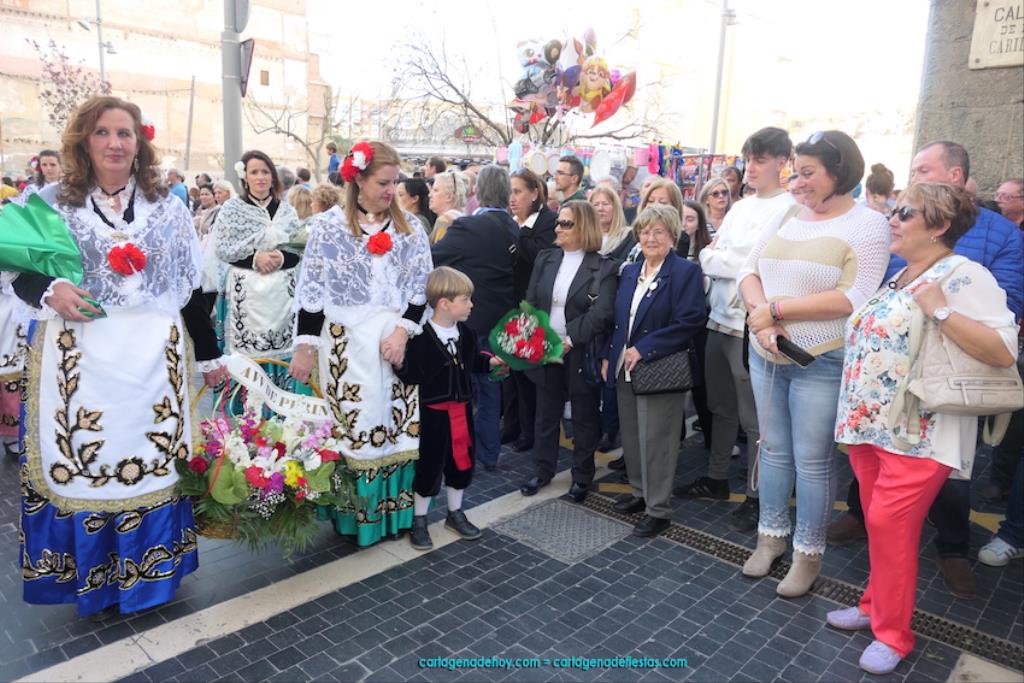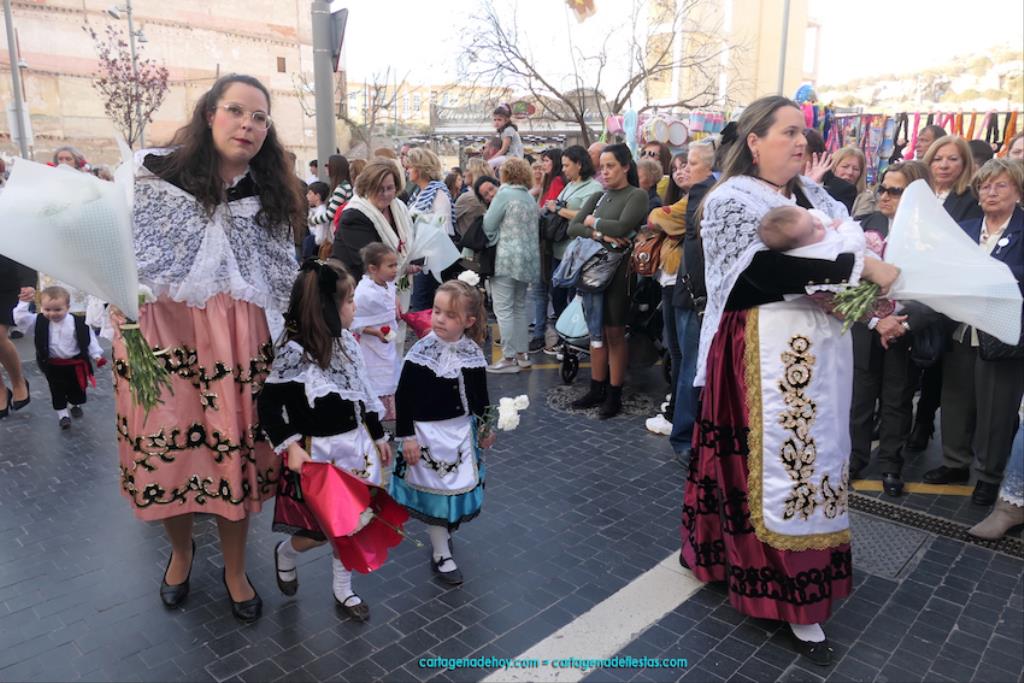Isabel es un ejemplo de la devoción que existe hacia la patrona y a buen seguro que habrá más casos similares. Así, por ejemplo, Ana de Haro, presidenta vecinal del Ensanche-Almarjal, supera las cuatro décadas de ofrendas. En la lado opuesto hemos podido ver a muchos bebés con escasas semanas, meses o años de vida, y entre medio, un amplio ramillete de edades.Han sido cincuenta los grupos que ha protagonizado el mayor desfile popular de Cartagena cada año, que son los que aparecen en la relación adjunta más el partido 'Sí Cartagena'. También figura MC, con los ediles María José Soler y Jesús Giménez, entre otros de su formación, portando un escudo floreado de Cartagena, mientras que José López iba con la Cuarentuna. Otro candidato a alcalde, el socialista Manuel Torres, por su parte, llevaba el ancla que abría paso al grupo de vecinos de Santa Lucía, con amplia presencia de pescadoras. Por su parte, el gobierno municipal ha sido el segundo grupo que ha efectuado la ofrenda, con la alcaldesa luciendo típico traje cartagenero, al igual que Diego Ortega.